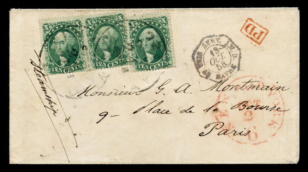 This double-weight letter was sent under the 1857 U.S.–France postal convention, which set a 15¢ rate per ¼ oz. The sender prepaid 30¢ with three 10¢ stamps, fully covering the ½ oz. letter rate and allowing for direct delivery in France. Carried aboard the Vanderbilt of the Vanderbilt Line, which departed New York on October 2, 1858, and arrived at Southampton on October 12. The large red New York exchange marking indicates a 6¢ credit to France under the treaty accounting system.