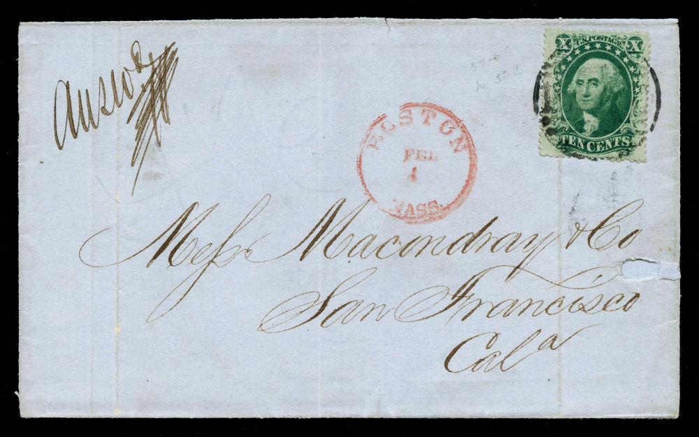 (35) 1857-61 10¢ green Washington Type V tied by large "PAID" in black grid cancel with clear red "Boston Mass. Feb 1 (1860)" cds at left on partial folded cover sent from Hong Kong, China to San Francisco. The cover was carried privately to Boston where it entered the U.S. mails, docketed on reverse "Hong Kong December 9th 1859". The 10¢ stamp affected by file fold but overall a fine 1857-61 Issue cover originating in China, entering the U.S. at Boston and then traveling across the continent to San Francisco.