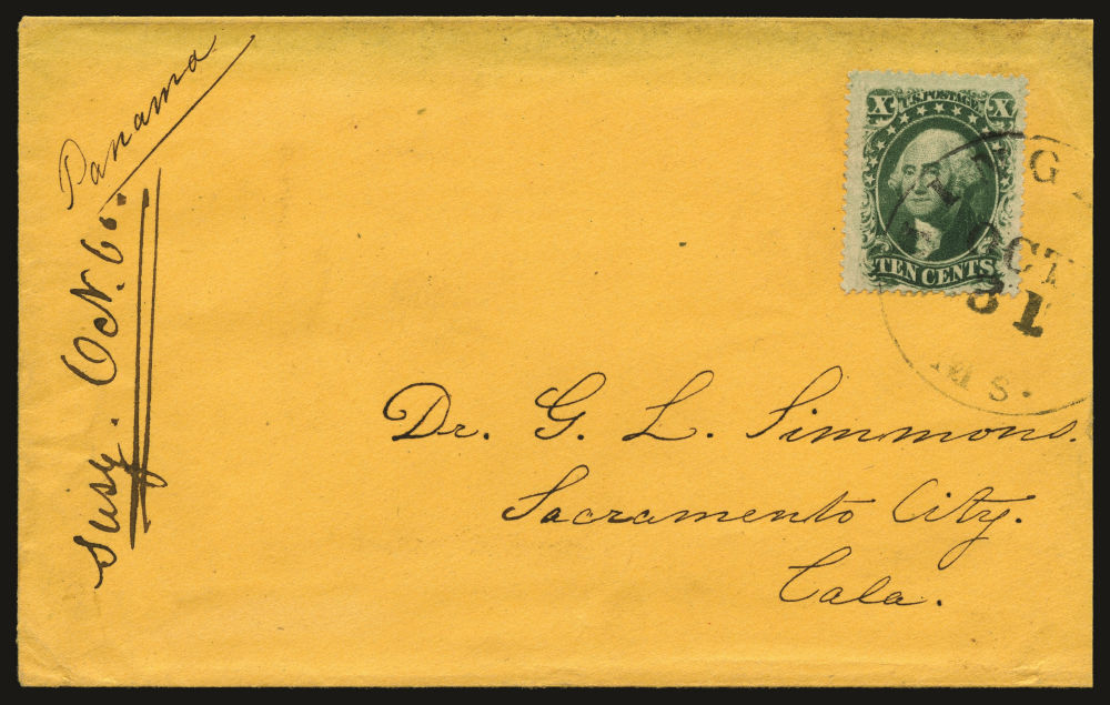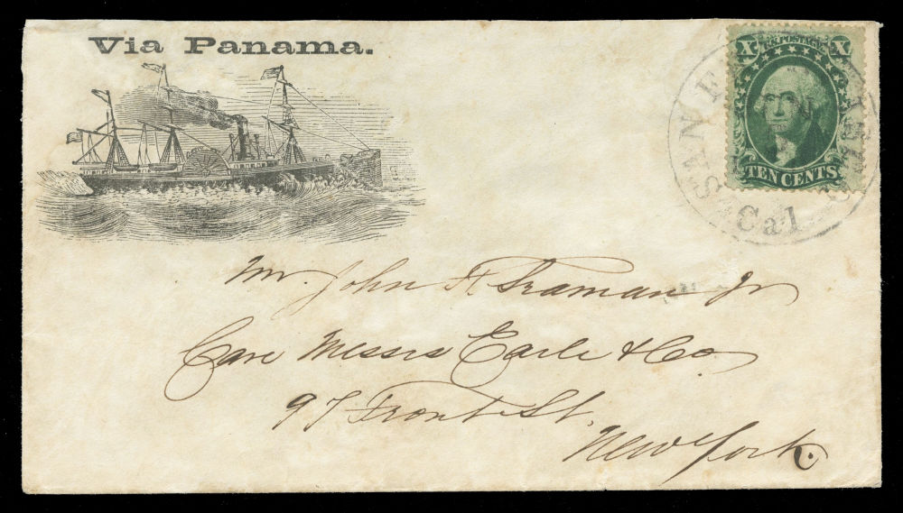 (35) 1857-61 10¢ green Washington Type V tied by black “San Francisco Cal. Jun 5” cds on cover to New York City, featuring prominent “Via Panama” imprint with engraved sidewheel steamship illustration at upper left. The stamp pays the 10¢ transcontinental rate via contract steamship service with cover carried aboard the PMSS Golden Age, which departed San Francisco on June 5, 1860 and arrived in Panama City on June 18. The cover was then transferred across the isthmus to Aspinwall (Colón) and placed aboard the Atlantic & Pacific Steamship Co. Northern Light, departing June 19 and arriving New York on June 27, 1860.