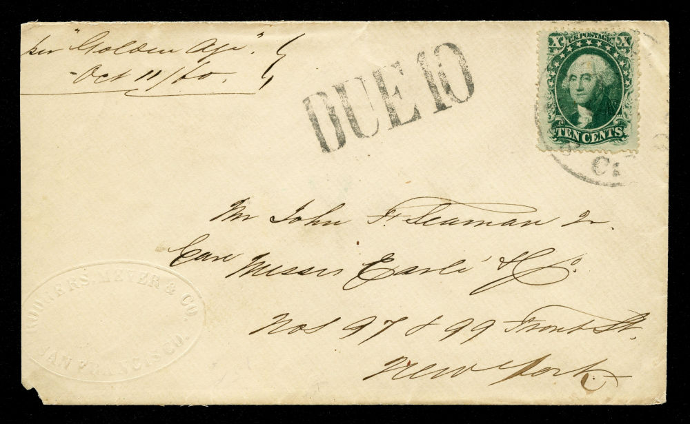 (35) 1857-61 10¢ green Washington Type V tied by black “San Francisco, Ca” cds on cover addressed to New York City with manuscript "per Golden Age / Oct 11/60" at top left. Sender embossed name/address at lower left and "DUE 10" straightline handstamp at top center due to this being a double weight letter, requiring collection of 10¢ from the recipient. The cover departed San Francisco aboard the Golden Age on October 11, 1860 arriving in Panama on October 25th then carried across and put aboard the Northern Light for its final leg to New York City, arriving on November 2, 1860. A very fine example of a West-to-East via Panama double weight cover with prominent "DUE 10" handstamp. With 2025 Philatelic Foundation certificate.