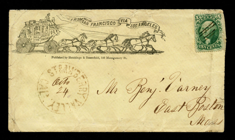 (35) 1857-61 10¢ green Washington Type V used with manuscript cancel on illustrated “Overland Mail, From San Francisco via Los Angeles” Six-Horse Stagecoach cover to East Boston, Massachusetts. Cover bears nice strike of “Strawberry Valley, Cal. Oct 24” cds in brown ink with "Oct 24" written in. Striking woodcut-style design depicts a six-horse overland stage with ribbon banner, printed by Hutchings & Rosenfield, 146 Montgomery St., San Francisco. Stamp damaged by fold, light edge wear and corner nicks as expected from overland transit, but overall a fine example of this overland stagecoach design cover from Strawberry Valley, CA.