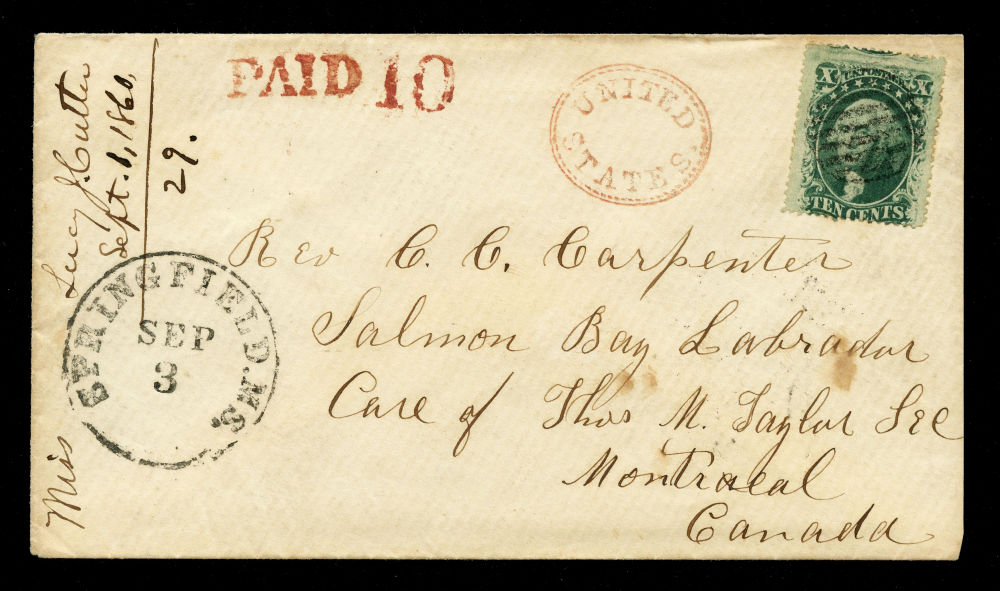 (35) 1857-61 10¢ green Washington Type V used by black grid cancel on 1860 cover from Springfield, Massachusetts, to Montreal, Canada, addressed to Rev. C. C. Carpenter at Salmon Bay, Labrador, in care of Thomas M. Taylor, Esq. Red "PAID 10" and circular "United States" exchange marking at top center, with bold "Springfield Ms. Sep 3" CDS at left. Docketed at left in manuscript “Miss Lucy Cutler / Sept. 1, 1860.”