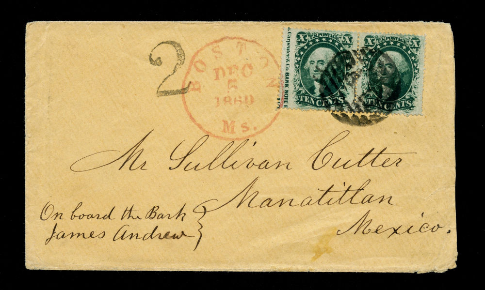 (35) 1857-61 10¢ green Washington Type V horizontal pair nicely exhibiting part of the sheet's imprint in wide left margin tied by large black "PAID" in grid cancel and red "Boston Ms. Dec 5 1860" cds on cover to Mr. Sullivan Cutter in Minatitlán, Mexico. The U.S. had no postal agreement with Mexico at this time. Mail from the U.S. could be prepaid only to the border resulting in the "2" reales due handstamp. A very fine example of a full 10¢ Type V Washington captured imprint on cover to Mexico.