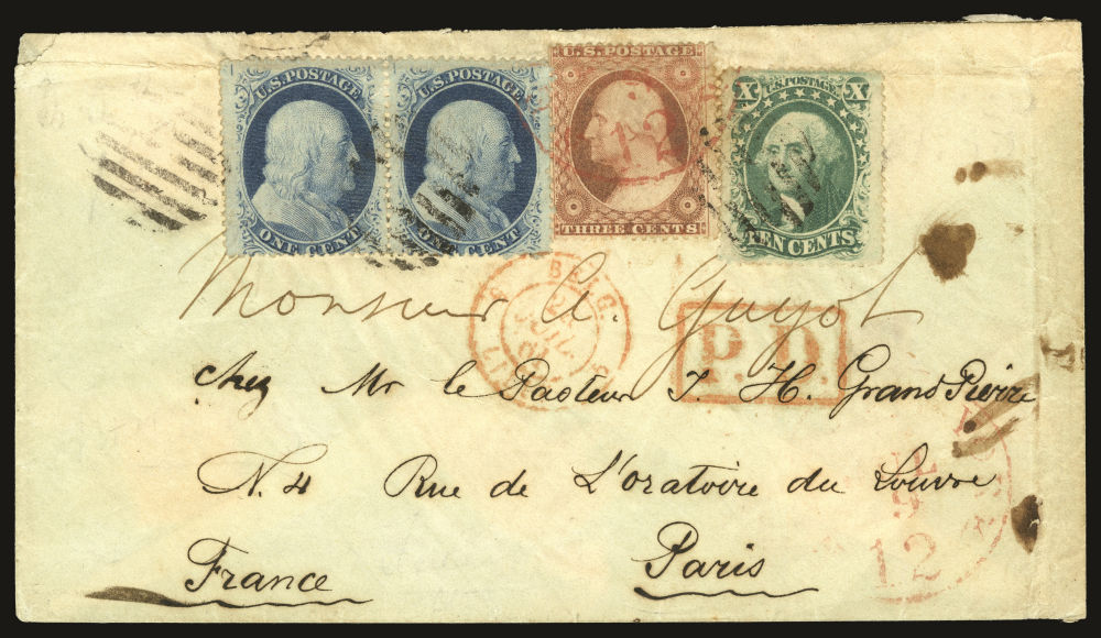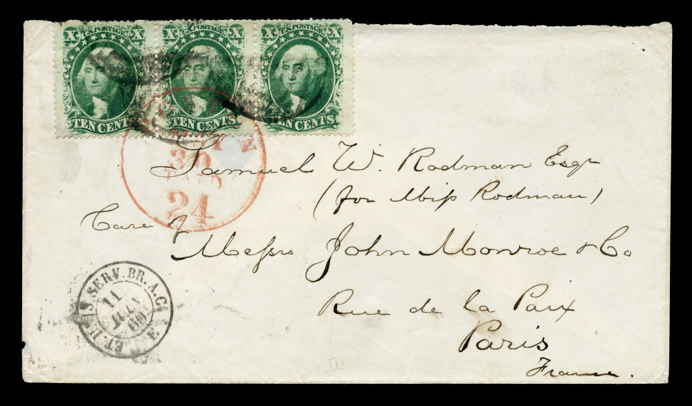 (35) 1857-61 10¢ green Washington Type V strip of three used by indistinct black circular cancel and red "Boston Paid 24 May 30 (1860)" large exchange office cds on cover to Samuel W. Rodman in care of John Monroe & Co., Paris, France. Red boxed "P.D." (Paid to Destination) handstamp and black French octagonal "Et Unis Serv. Br. A. C. 11 Juin 60" receiving handstamp at lower left. May 30 Boston, British Packet and Paris receiving backstamps.
