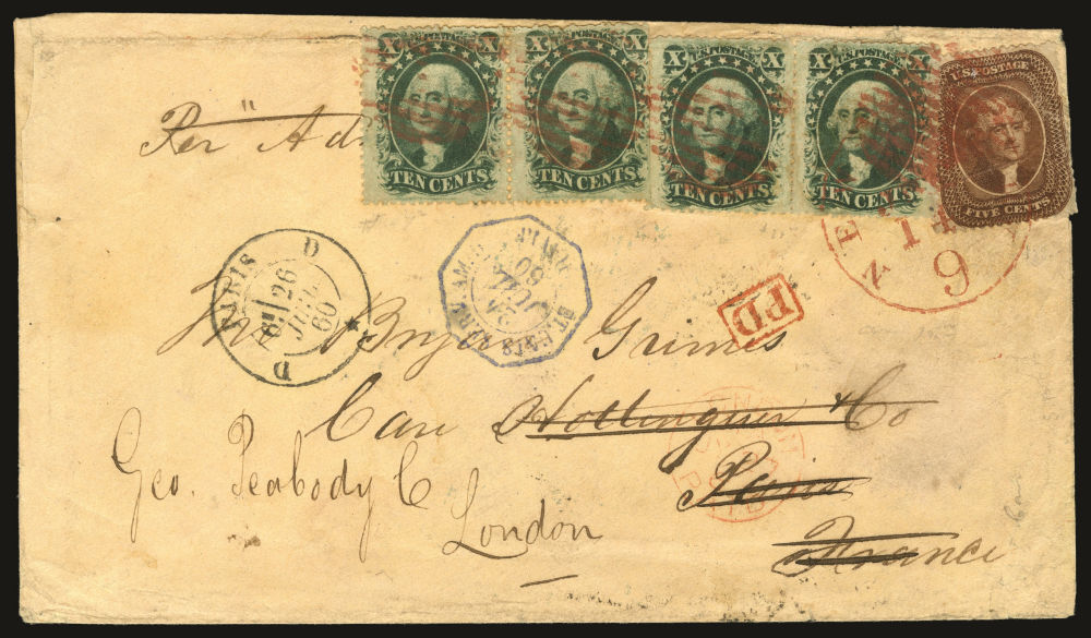 (30A/35) 1857-61 5¢ brown Jefferson Type II and two horizonal pairs of the 10¢ green Washington Type V tied by red grid cancels on 1860 U.S.–France treaty triple-weight rate cover with Telfair & Horne General Commission Merchants address on backflap to Paris then forwarded to London. Red “New York 9 Jul 14” credit cds also ties stamps at right, additional markings include boxed “PD” handstamp, blue July 24 French entry datestamp and black July 26 Paris transit at left, three additional black French transit backstamps. Cover with some slight restoration at left, stamps with small faults from placement at edge, still a striking triple-weight rate franking representing a visually appealing usage to France with further forwarding.1992 Professional Stamp Experts certificate.