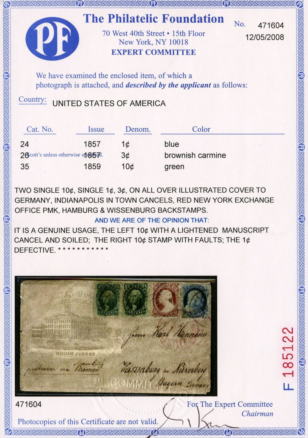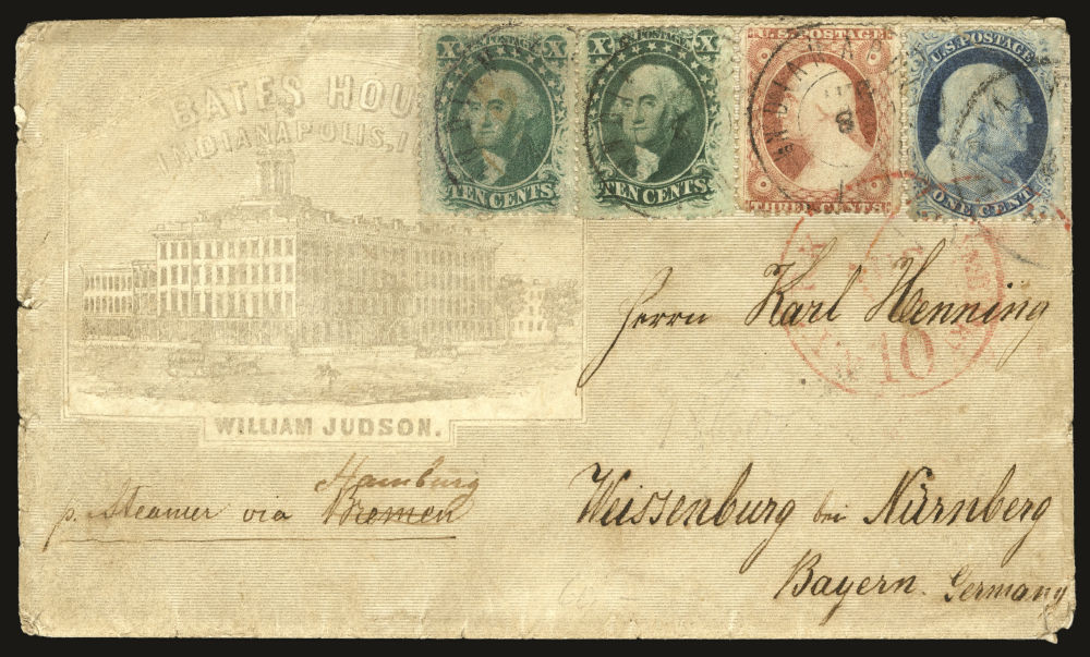 (24/26/35) 1857-61 1¢ blue Franklin Type V, 3¢ dull red Washington Type II, and two 10¢ green Washington Type V singles used on 1860 illustrated advertising cover from Indianapolis, Indiana to Bavaria. Stamps tied by “Indianapolis Ind. Aug 8” double-circle datestamps on gray all-over shaded ad cover for the Bates House hotel, addressed to Weissenburg bei Nürnberg, Bavaria. Red “N.York Hamb. Pkt. Paid 10 Aug 15” exchange marking. The New York exchange office credited Hamburg and routed it on the HAPAG Line Saxonia, departing New York August 15 and arriving Hamburg August 29, with backstamps for Hamburg (8.30) and Weissenburg (9.1). Left 10¢ stamp shows traces of manuscript cancel likely removed with sender getting away with an illegal reuse. Cover with edge faults and stamp flaws, but still fine.