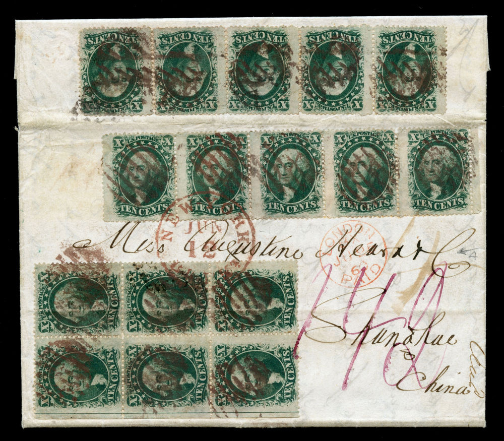 (35) 1857-61 10¢ green Washington Type V, one strip of five, one strip of four, block of six with left interpane margin and guideline and one single totaling 16 stamps used on 1859 folded letter from New York to Shanghai, China, franked with an extraordinary $1.60 postage paid. All are canceled with red circular grid cancels, with matching red "New-York Br. Pkt. Jun. 12" (1859) CDS at center. A magenta manuscript "1.42" credit and "4" British Colonial credit mark appear at center, along with red London "PAID" transit (June 25) and clear red oval "Forwarded by Goodhue & Co. New York" backstamp. Additional Hong Kong receiving datestamp (August 17) on reverse. One 5¢ stamp is missing from the upper left to correctly pay the quintuple 33¢ rate ($1.65). Despite the missing stamp and some small flaws, light file fold through the right side of the block of six, the franking remains striking and a rare example of complex prepayment to China via the British Open Mail system.
