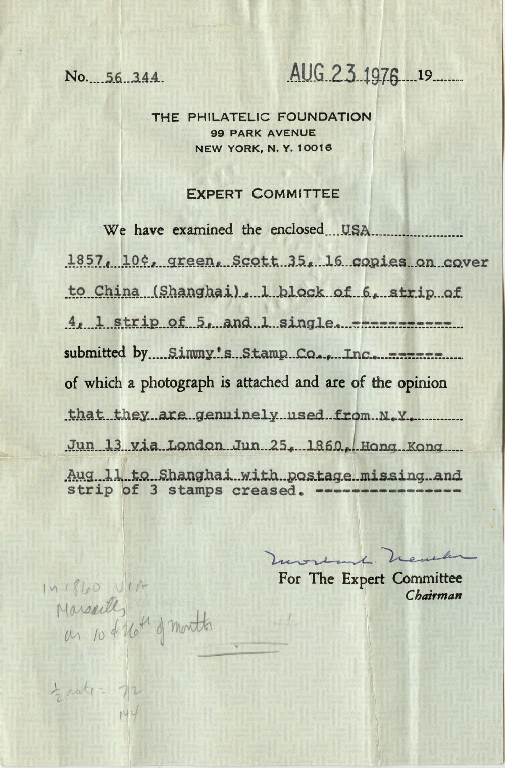 Signed Ashbrook and illustrated in the Ashbrook file archives at the Philatelic Foundation, with 1976 Philatelic Foundation certificate.