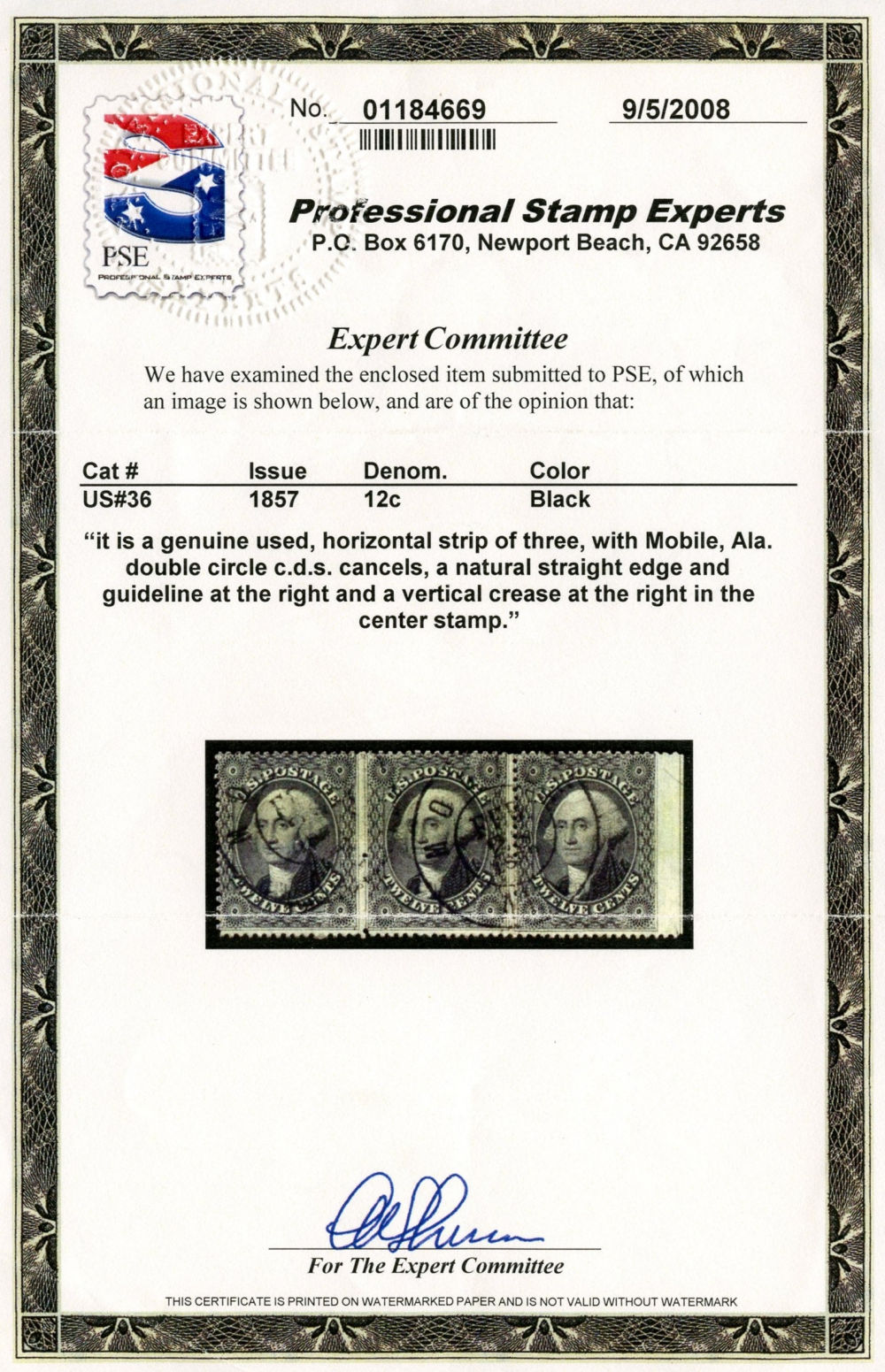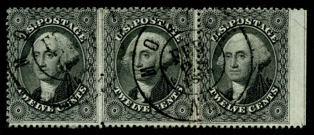 (36) 1857-61 12¢ black Washington guideline horizontal strip of three used with Mobile, AL cds cancels, vertical crease at the right in the center stamp, otherwise fine-v.f.