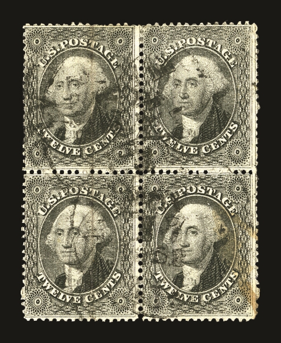 (36) 1857-61 12¢ black Washington Plate 1 block of four used by black cds cancels, the left vertical pair with a light vertical crease and the bottom right stamp with toned spots still overall, a fine appearing and scarce used 12¢ Plate 1 multiple.