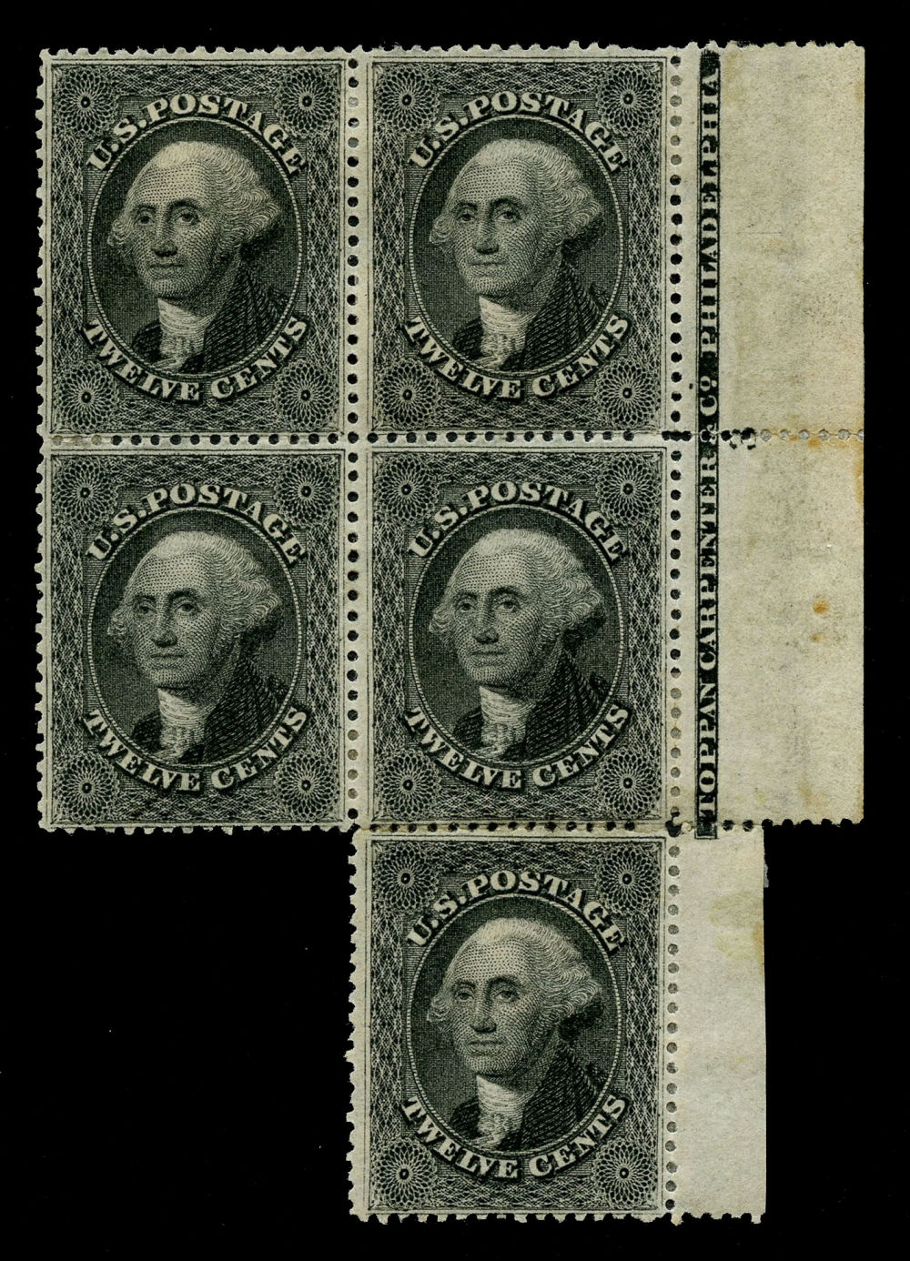 (36B) 1857-61 12¢ black Washington Plate 3, positions 49-50/59-60R3, unused original gum right sheet margin block of four with reattached unused position 70R3 single forming a block of five with "TOPPAN CARPENTER & Co. PHILADELPHIA / 3" Type II imprint. Hinge remnants and some small patches of gum loss, bottom stamp hinged in place, the imprint is essentially complete along the intact block of four, trivial thin spots in top two stamps, short perf at top right.