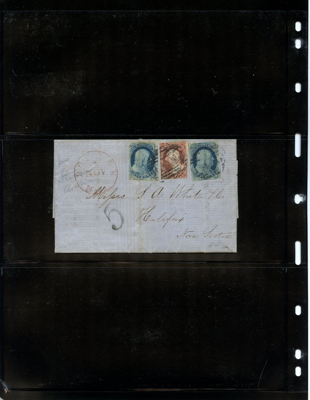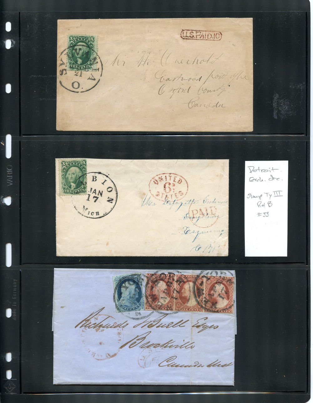 Group of four covers franked with 1851–61 Issue stamps sent to Canada, consisting of two covers and two folded letters including (35) 10¢ Type V tied by “Sylvania, O.” CDS on cover to Canada with bold red “U.S. Paid. 10” handstamp at upper right, multiple Canadian transit and receiving backstamps; (33) 10¢ Type III Relief B tied by “Albion, Mich. Jan 17 (1859)” circular datestamp on cover to Georgetown, Canada West, with red “United States 6d” and matching “Paid” in circle markings, along with transit and Georgetown receiving backstamps; 1856 folded letter to Nova Scotia franked with (9/11) 1¢ and 3¢ stamps tied by black Boston “Paid” in grid cancels, with red Boston CDS, black Boston British Packet CDS, and black Canadian receiving backstamp, file fold affects the left 1¢ stamp; and folded letter to Canada franked with (7/11A) 1¢ and 3¢ strip of three tied by black “New York Apr 17” circular datestamp cancels, with light red Canadian markings on face and backstamp, file fold affects the strip. A fine and appealing group illustrating various rates and exchange markings used on U.S.–Canada mail during the 1851-61 period.