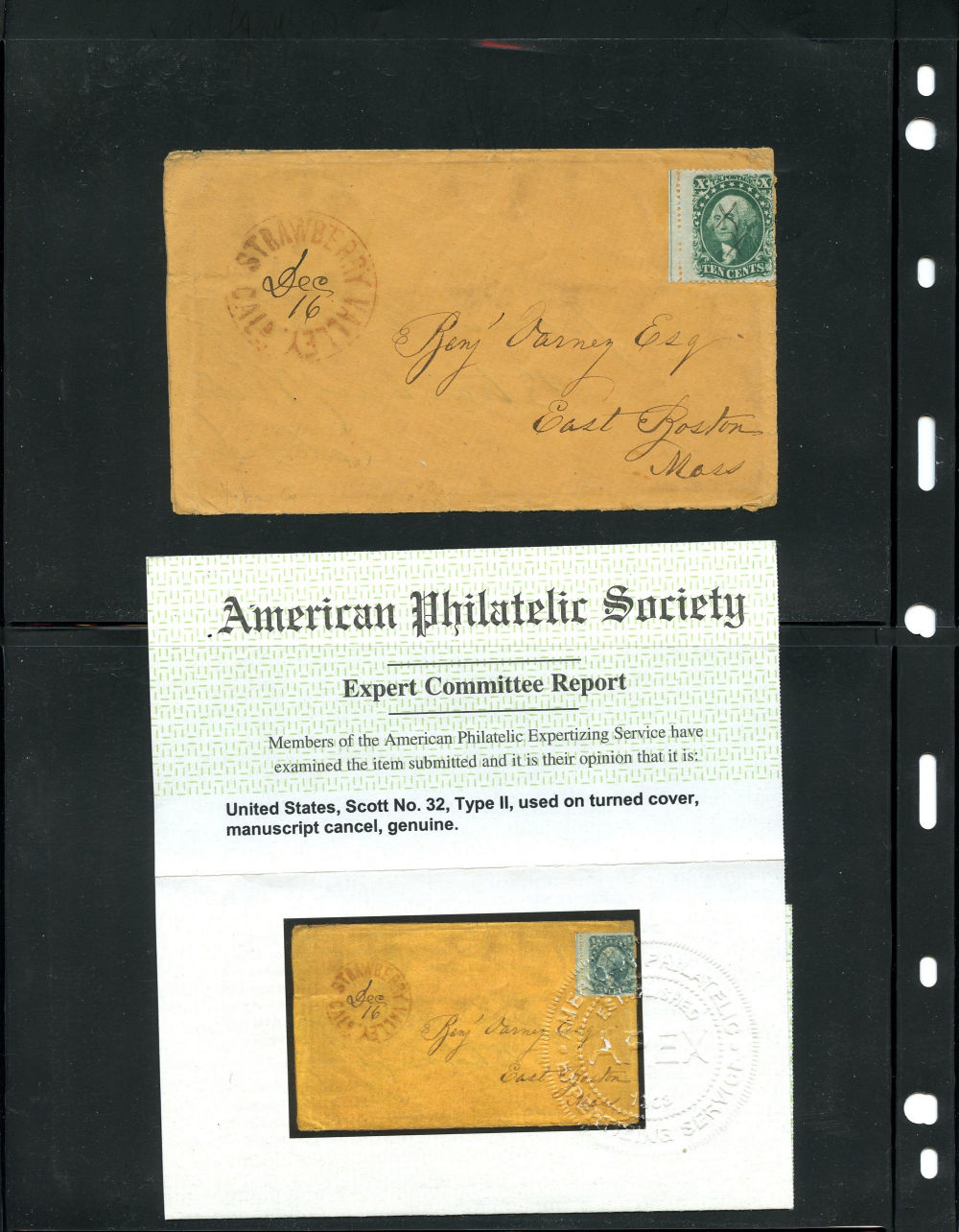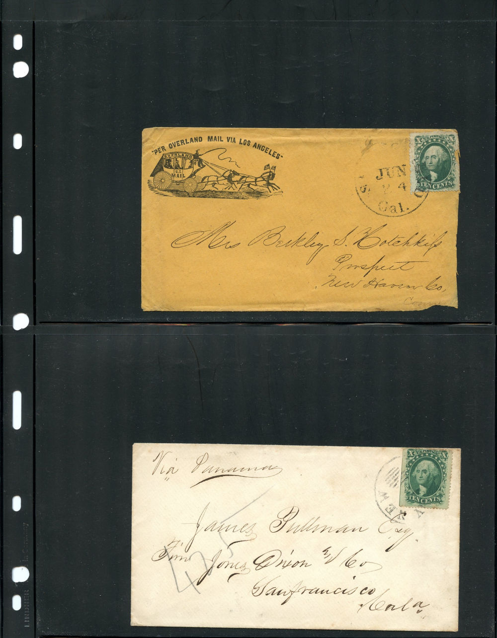 Group of three covers franked with 1851-61 10c Issue stamps illustrating transcontinental postal uses between California and the East during the 1850s. The first cover bearing a (35) 10c Type V with guideline at left originated in New York and was addressed to San Francisco, California, endorsed “Via Panama” with a New York Ocean Mail CDS tying the stamp. The other two covers were sent eastward from California, first one bearing a (32) 10c Type II with guideline at left used by pen cancel on turned cover showing a neat strike of the red "Strawberry Valley, Cal." CDS with manuscript "Dec 16" in center (2007 APEX cert) and the other franked by (35) 10c Type V stamp on cover with "Per Overland Mail via Los Angeles" printed endorsement at tope left, bearing a June 24 California town cancel and addressed to New Haven, CT. An attractive trio of covers representing different routes in operation for coast-to-coast communication prior to the completion of the transcontinental railroad, faults and general wear but overall fine.