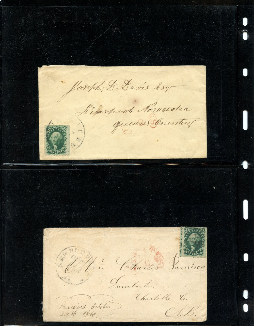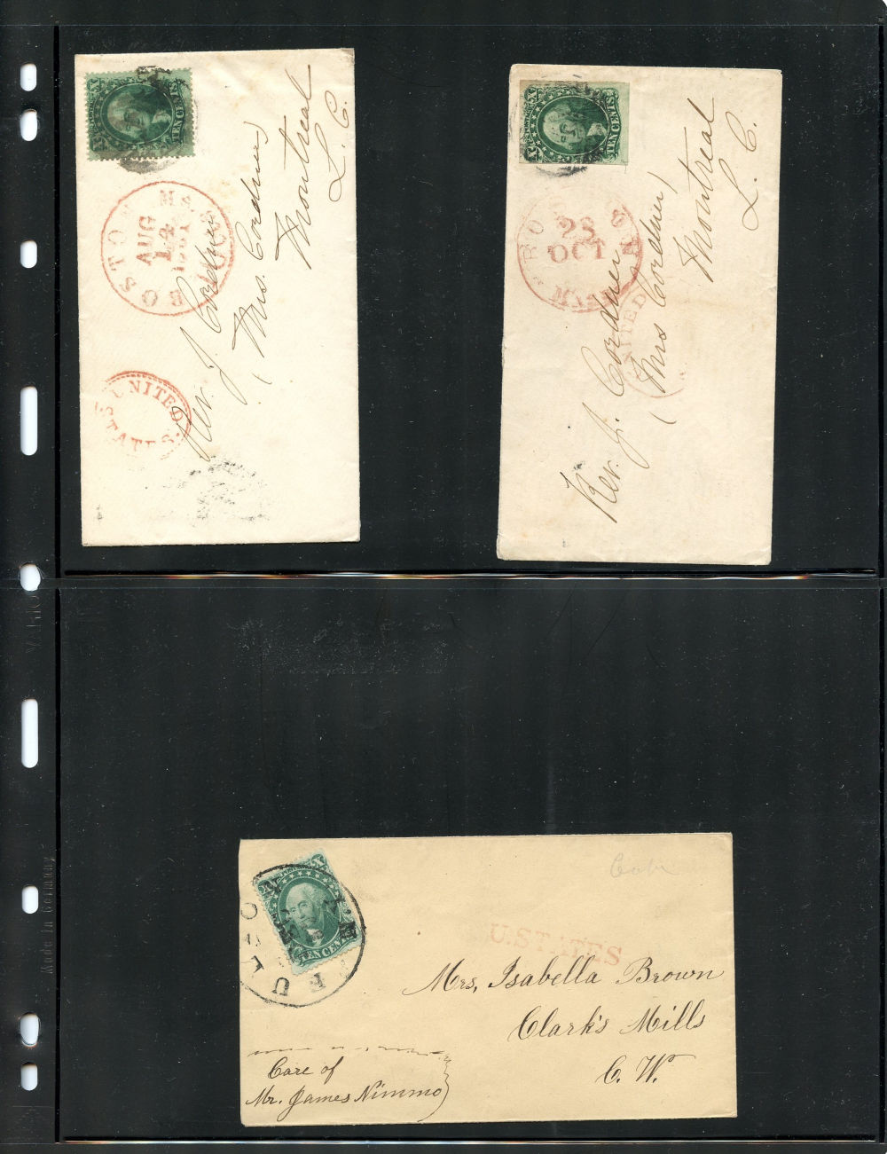 A nice group of five cross-border covers from the United States to Canada, each franked with a 1851-61 10¢ Issue stamp, representing a diverse array of postal markings, destinations, and plating characteristics. The first, a Boston to Montreal cover, bears an (14) imperforate Type II from position 5R1 tied by "PAID" in grid cancel, and features the distinctive early period red oval “United States” exchange marking used by the Boston Exchange Office. The second cover, sent by the same sender to the same recipient, is dated 1861 right before the stamps were demonetized and franked with a perforated (35) 10¢ Type V, showing the later Boston “United States” marking with dotted inner line. A third cover from Fulton, New York to Clark’s Hill, Canada West, bears a (32) perforated Type II tied by town cancel, with a bold red straight-line “U. States” exchange marking. The fourth cover, from Auburn, Maine to Queens County, Nova Scotia, is franked with a (35) 10¢ Type V showing a vertical guideline at right, and struck with a red arc-style “United States” marking. The fifth cover, sent to Charlotte County, New Brunswick in 1860, bears a (35) 10¢ Type V showing part of the Toppan, Carpenter imprint at left margin, also with a red arc “United States” exchange marking. Small faults here and there, but overall fine-v.f. group illustrating the rich complexity of pre-Confederation cross-border postal communication.