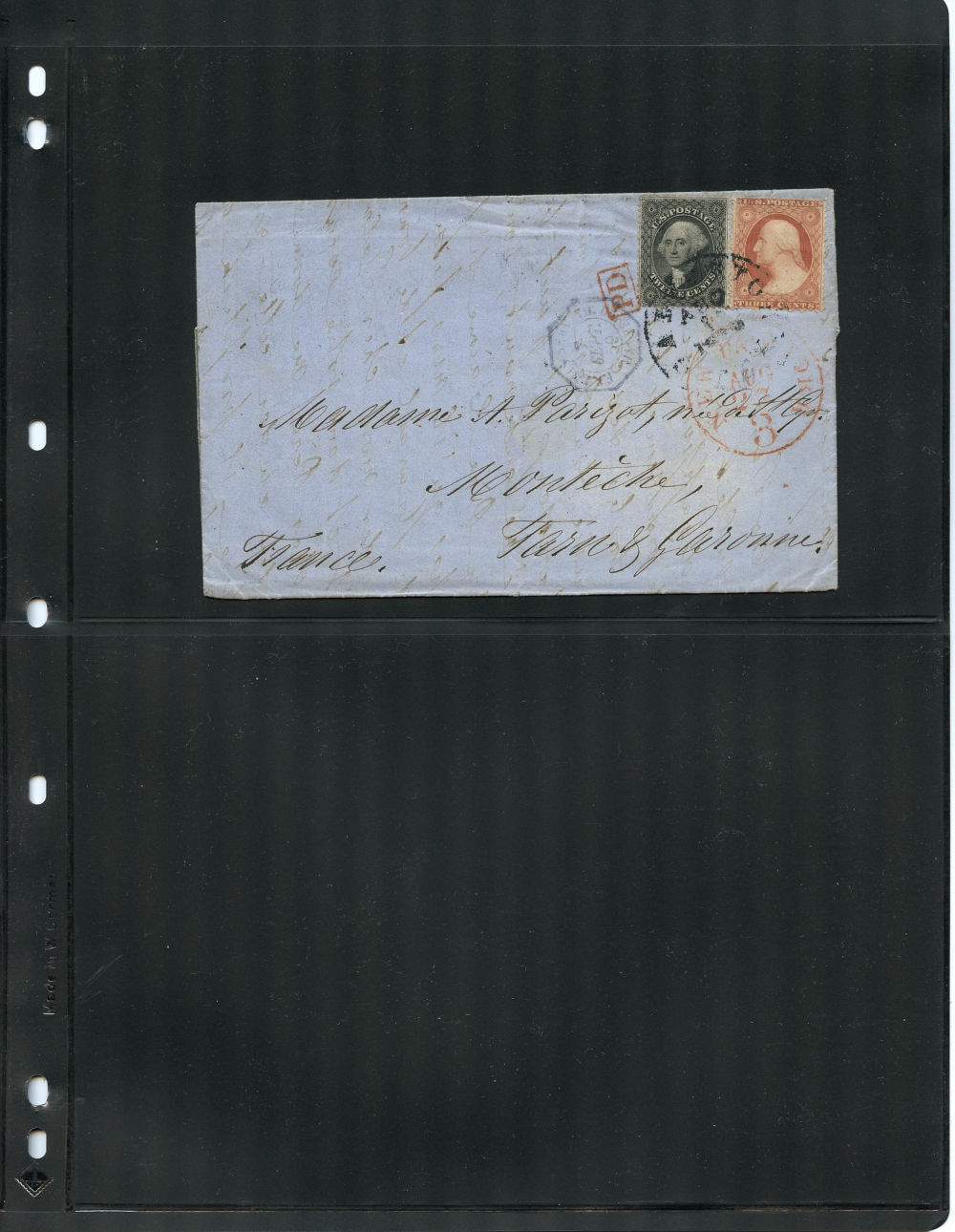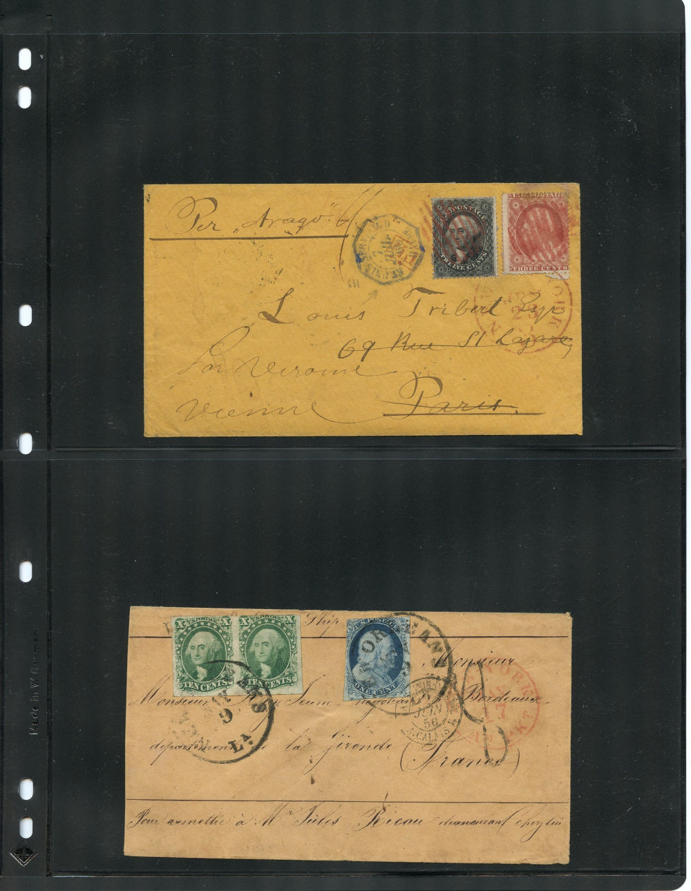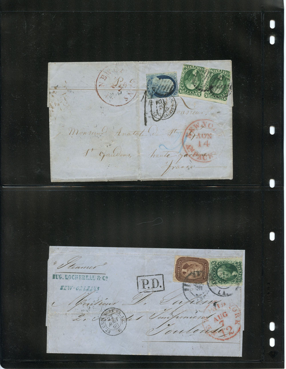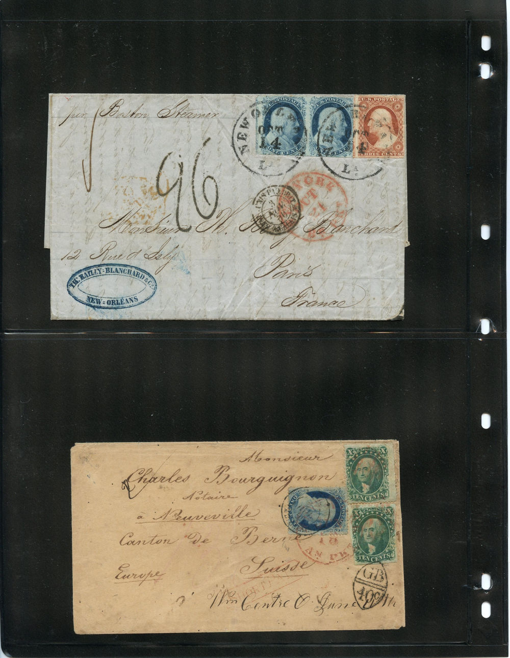 Interesting group of seven 1851–61 Issue covers to Europe, six to France and one to Switzerland, each bearing a U.S. stamp combination used to prepay or partially prepay transatlantic postage. The group includes: 1) 1859 cover to Switzerland franked with (9) 1¢ Type V, (14) 10¢ Washington Type II and a perforated (33) Type III, interesting imperf-perforated mixed franking sent via Britain; 2) 1856 folded letter from New Orleans to Paris, with pair of (9) 1¢ Type IV & (11) 3¢ Type I single; 3) 1855 folded cover from New Orleans to France with (9) 1¢ Type IV and pair of 10¢ Type III, red New York exchange marking; 4) 1860 folded letter from New Orleans to France, franked with (35) 10¢ Type V and (29) 5¢ Jefferson Type I, with boxed "P.D." and clear “Et. Unis Serv. Br. A.C.” receiving handstamp; 5) 1859 folded letter to France bearing (36) 12¢ Plate 1 and (26) 3¢ Type III, tied by Gavelston, Texas cds, with red boxed "PD"; 6) 1856 cover with a horizontal pair of (15) 10¢ Type III & (7) 1¢ Type II single, tied by New Orleans cds cancels sent to France via New York; and 7) 1860 cover with original contents sent from New York to Paris then forwarded within France franked with (26) 3¢ Type III and (36) 12¢ Plate 1, French transit and boxed "PD" markings.