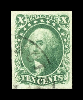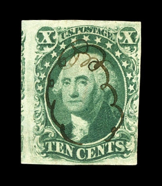 (16) 1851-57 10¢ green Washington Type IV, position 64L1, A & B Reliefs recut at top and bottom, used with small doodle manuscript pen cancel around Washington's portrait, nice margins at top and left including portion of adjoining stamp, tiny thin at right, fine example of this hard to find twice recut Type IV stamp.
