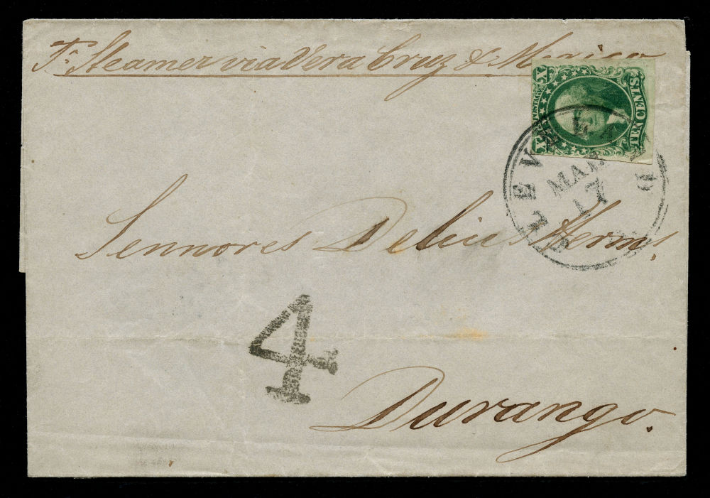 (15) 1851-57 10¢ green Washington Type III tied by black "Cleveland O. May 17 (1856)" cds on folded cover to Durango, Mexico. The U.S. had no postal agreement with Mexico at this time. Mail from the U.S. could be prepaid only to the border resulting in the "4" reales due handstamp.