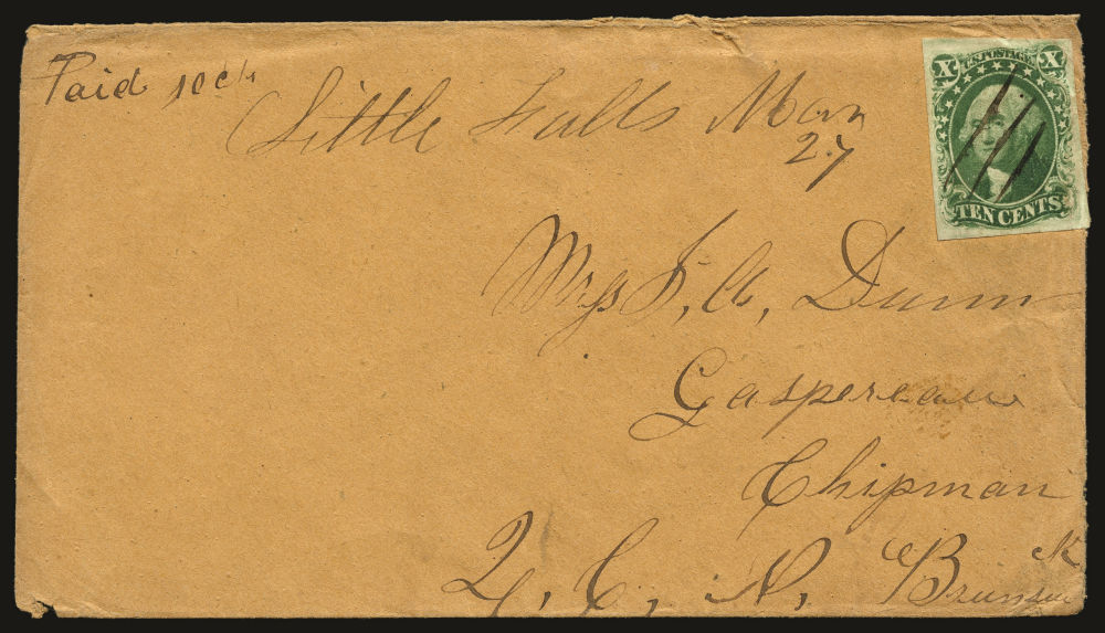 (16) 1851-57 10¢ green Washington Type IV, position 64L1, with recut outer lines at top and bottom, showing four large margins and used by manuscript cancel on an 1856 cover from Little Falls, Maine to Miss. Dunn in Chipman, Queens County, New Brunswick, British North America. Stamp with light creasing at top right and a small corner flaw at lower right, cover has some wear at edges and reverse. A nice example of position 64L1 used on covering paying the cross-border rate to New Brunswick.