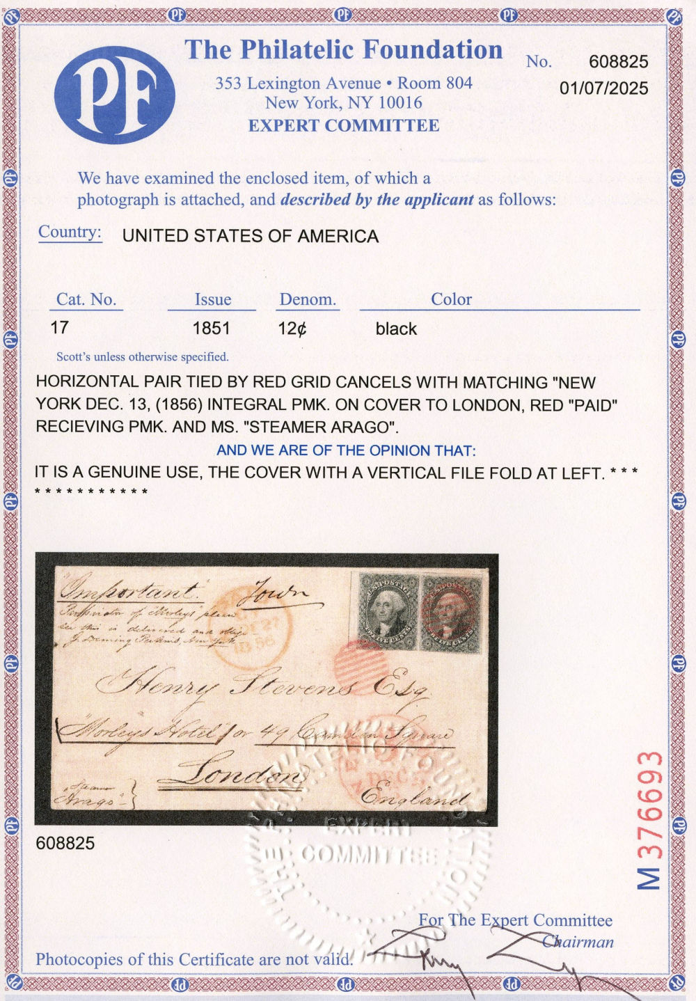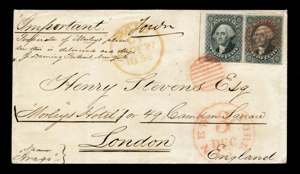 (17) 1851-57 12¢ black Washington, positions 91-92R1, horizontal sheet margin pair with margins all around to just in at bottom tied by nicely struck contrasting red grid cancels on 1856 cover from New York to London, England, matching red "New York 3 Dec 13" credit cds at bottom right of cover. Additional manuscript delivery instructions at top left and "Steamer Arago" indicating intended ship for Atlantic transit at bottom left, red December 26, 1856 arrival datestamp at center.