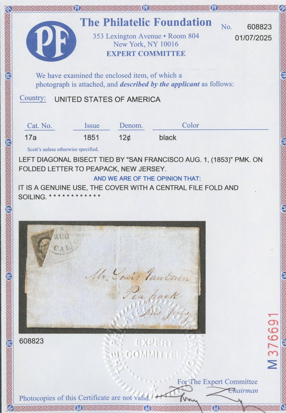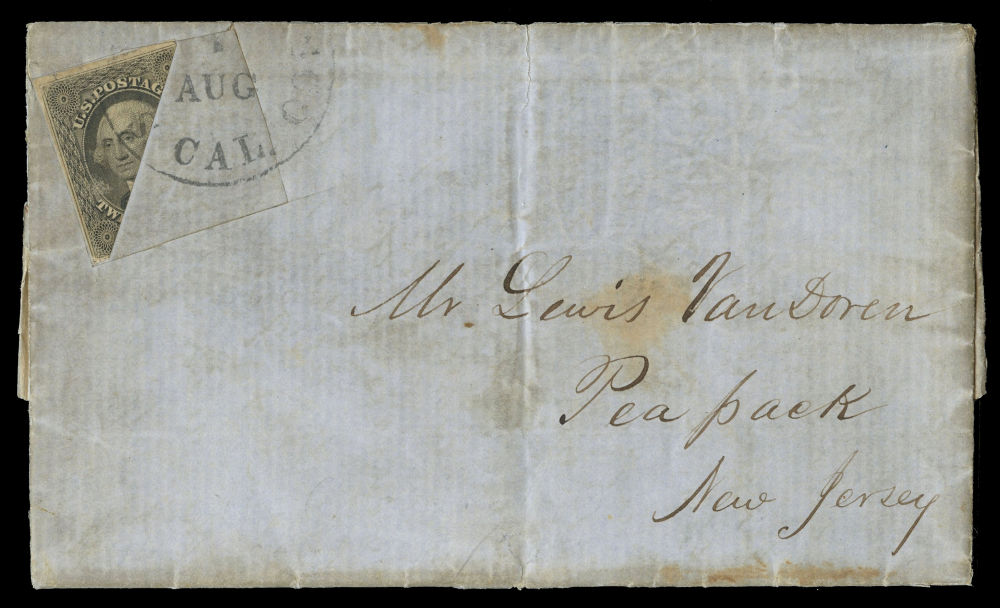 (17a) 1851-57 12¢ black Washington diagonal bisect tied by "San Francisco, Cal Aug 1 (1853)" cds on folded letter to Peapack, New Jersey. This letter departed San Francisco on August 1st aboard the Pacific Mail Steamship Company Northerner and arrived in Panama City on August 17th. The letter continued its journey from Aspinwall (modern day Colón) on August 19th aboard the US Mail Steam Ship Company Georgia and arrived into New York on August 29th.