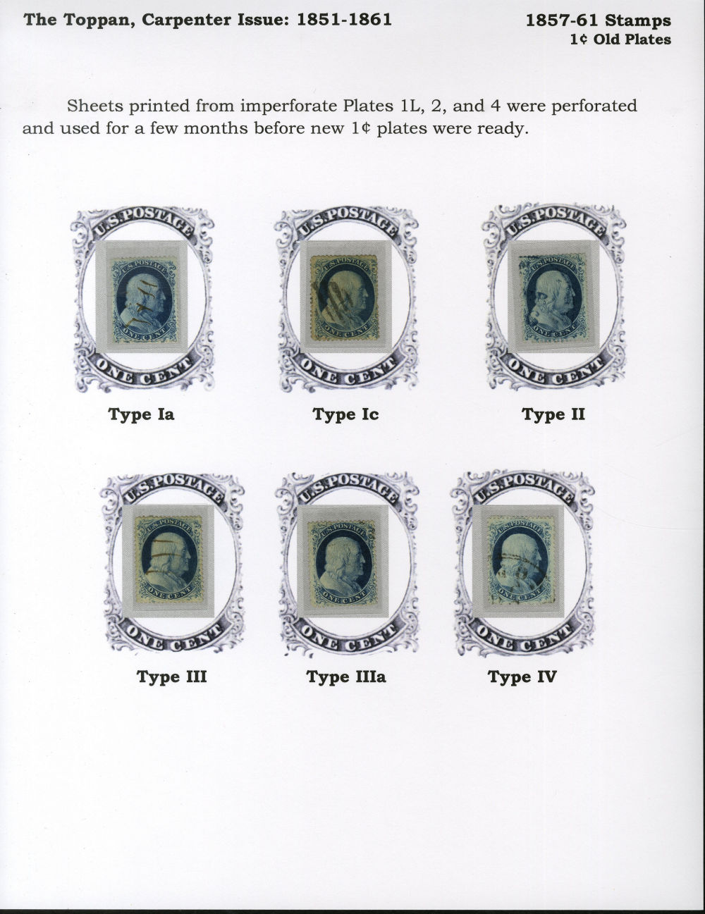 (18/19/19b/20/21/22/23/24/24var) Complete set of major Scott-listed used types of the 1857-61 1¢ blue Franklin, mounted on two well-annotated exhibit pages. This group includes key perforated examples from Plates 1L, 2, 4, 11, and 12, representing the full range of Scott-recognized design types produced under the 1851–61 Toppan, Carpenter contract. The first page features six types derived from plates initially used for imperforate production and later adapted for perforations: Type Ia (19), position 93L4 with pen cancel, few short perfs, scuffs at top with 2002 PF certificate; Type Ic (19b), position 82R4 with black grid cancel; Type II (20) from Plate 2 with blue datestamp; Type III (21), possibly 76L4, with pen cancel and 2006 PSE certificate (graded F–VF 75); Type IIIa (22) from Plate 4; and Type IV (23), cleanly cancelled.