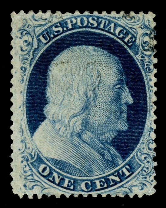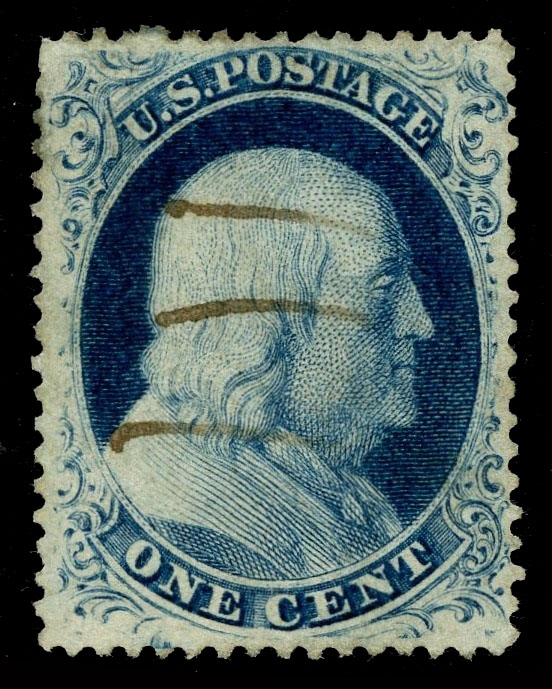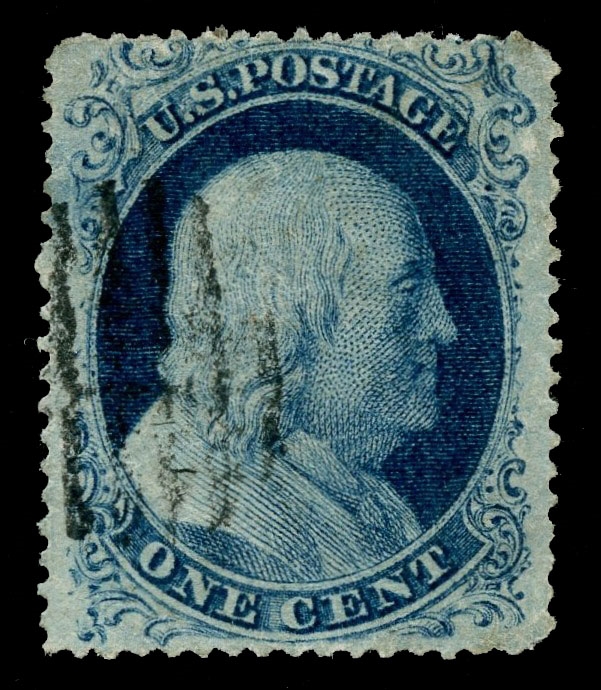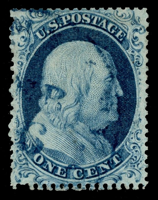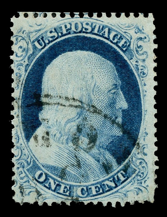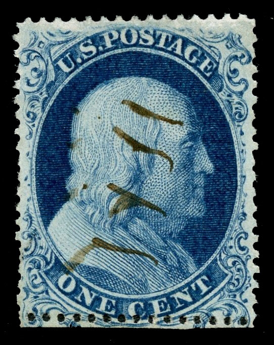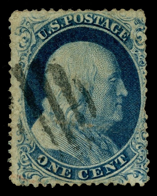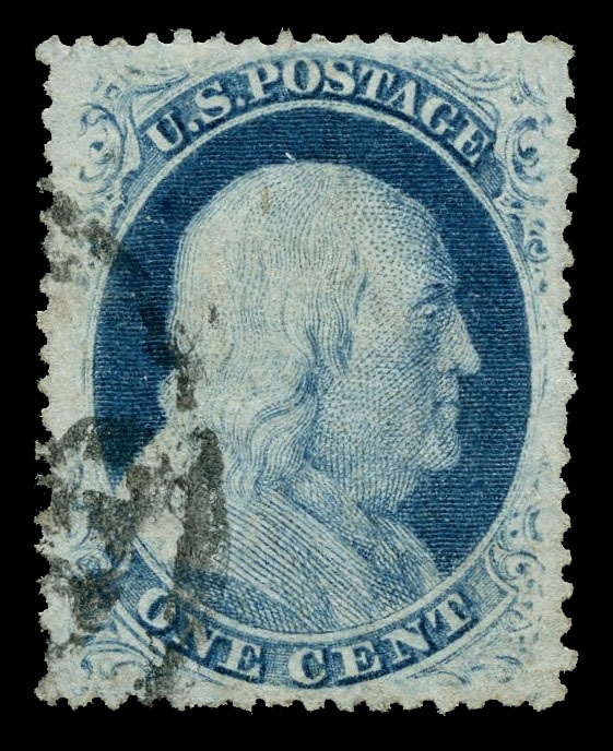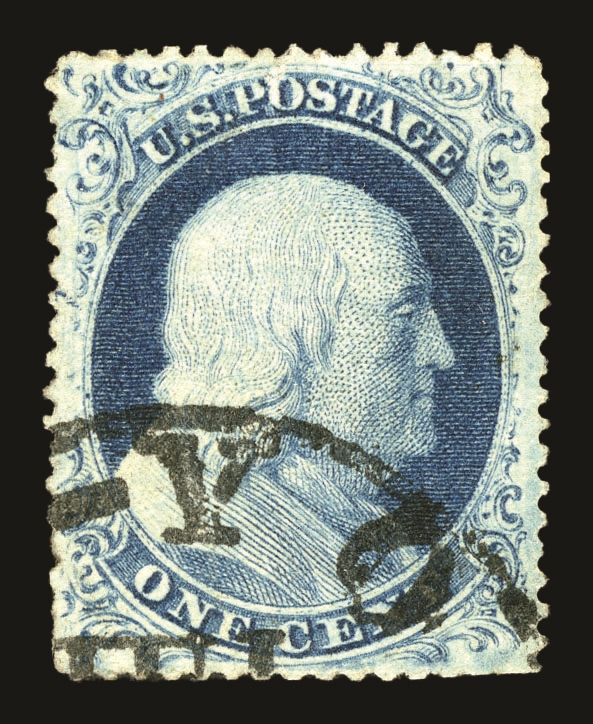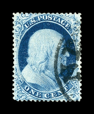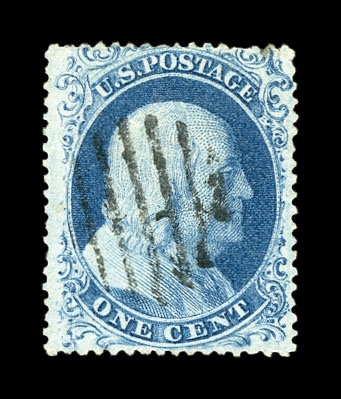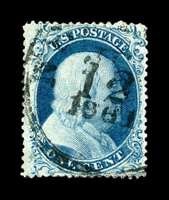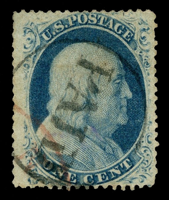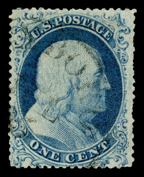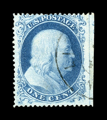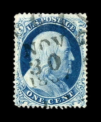 (22) 1857-61 1¢ blue Franklin Type IIIa, position 85L4, used by a partial black town cds cancel with "Nov 30" date legible, fine-v.f. centering for this notoriously difficult issue.