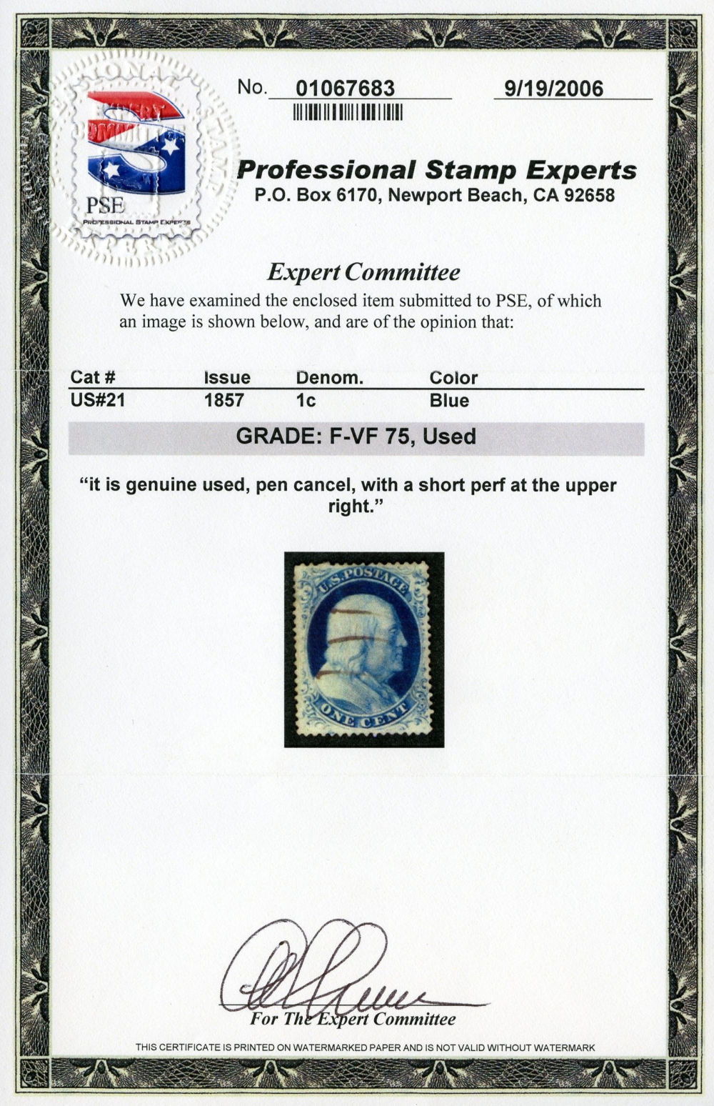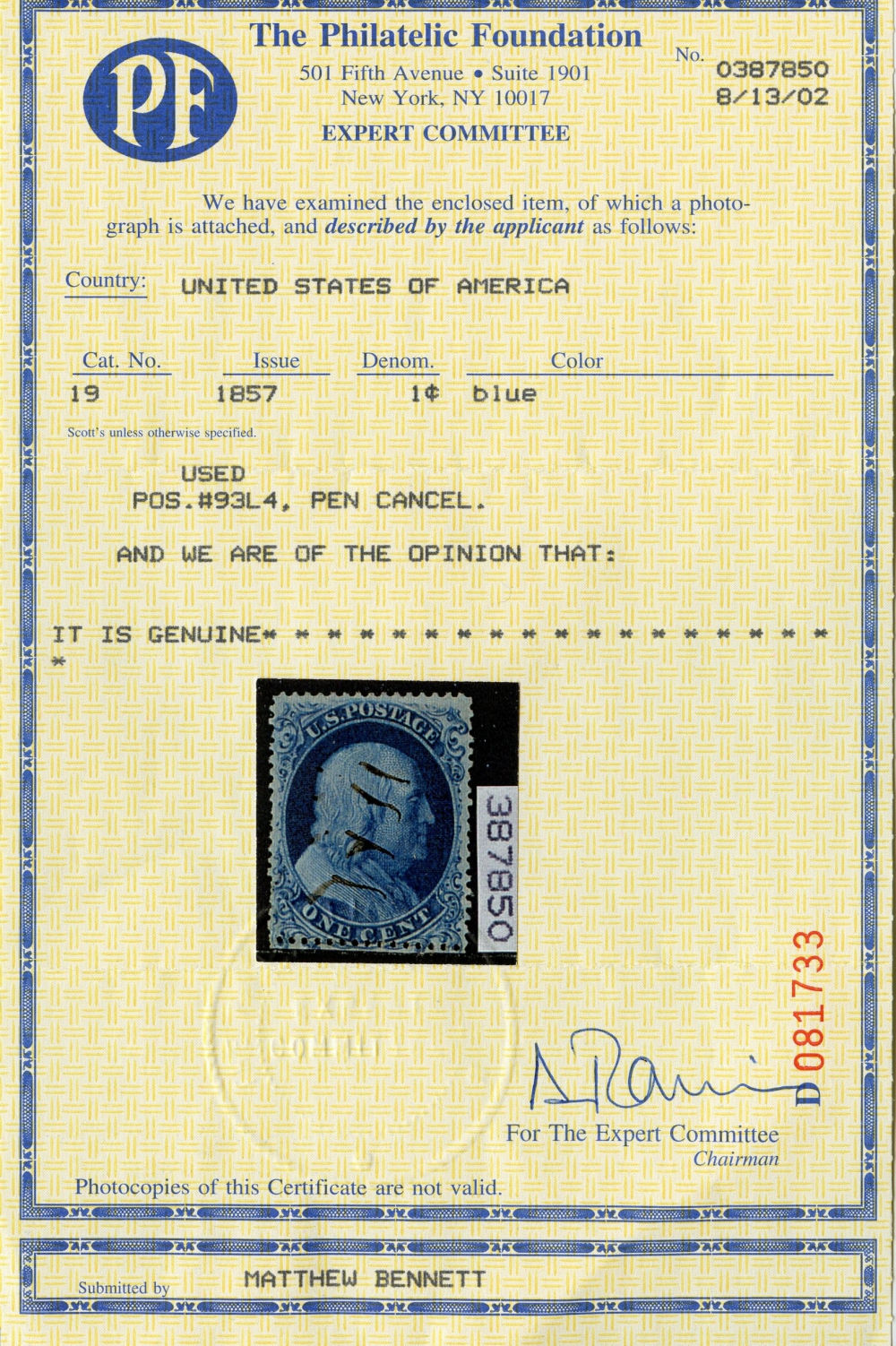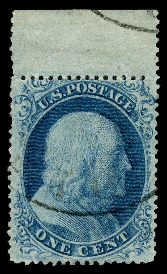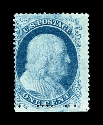 (22) 1857-61 1¢ blue Franklin Type IIIa, B Relief from Plate 11, unused with original gum, never hinged, fine and scarce in this condition. Census B199, with 2013 Professional Stamp Experts certificate graded “G 30”, cat. value $2,400 for unused o.g.