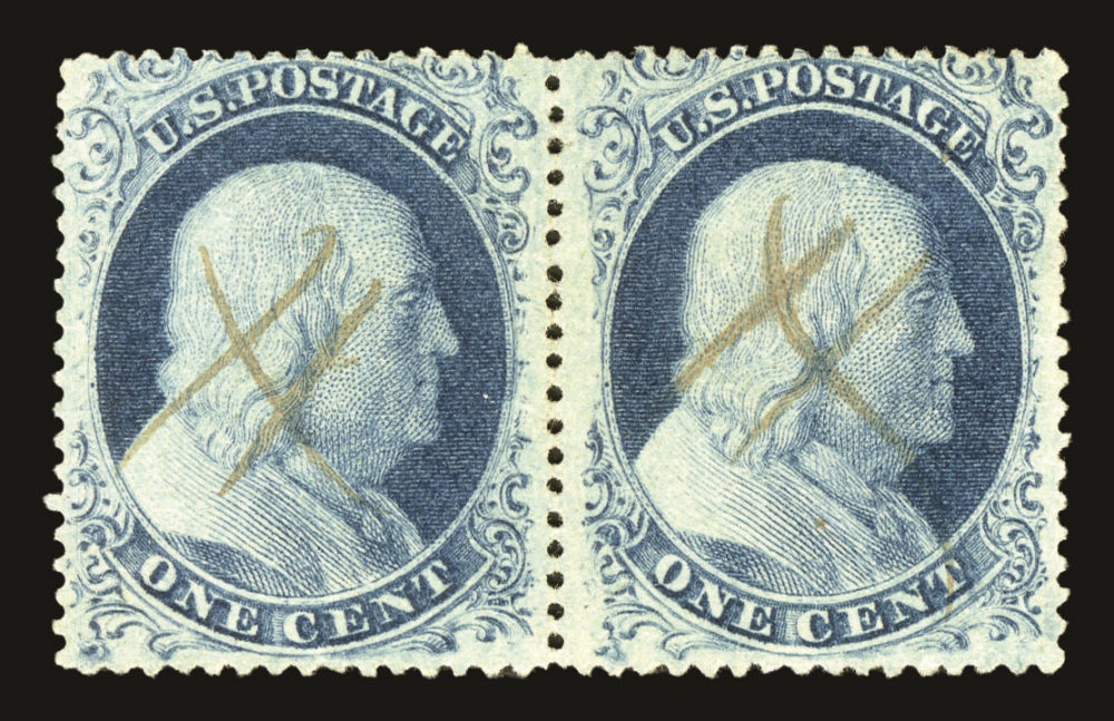 (20) 1857-61 1¢ blue Franklin Type II, position 89R2, showing major double transfer variety, used by partial black cds cancel, tiny tear at top above the "P" in "POSTAGE", otherwise fine-v.f. appearing example of this scare double transfer position. With 2011 Philatelic Foundation certificate, cat. value $1,500.