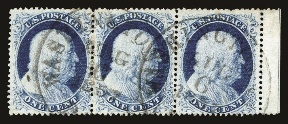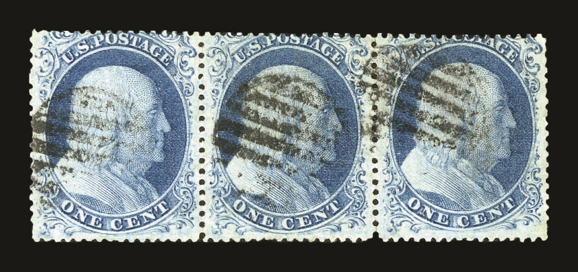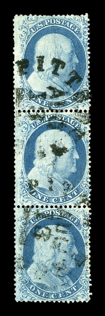 (20/22/22) 1857-61 1¢ blue Franklin Type II/IIIa/IIIa, positions 3R11-13R11-23R11, T/A/B Reliefs from the right pane of Plate 11, vertical strip of three used by black Pittsburgh CDS cancels, top Type II stamp with some short perfs at left, otherwise a fine and scarce combination strip showing all three reliefs from Plate 11.