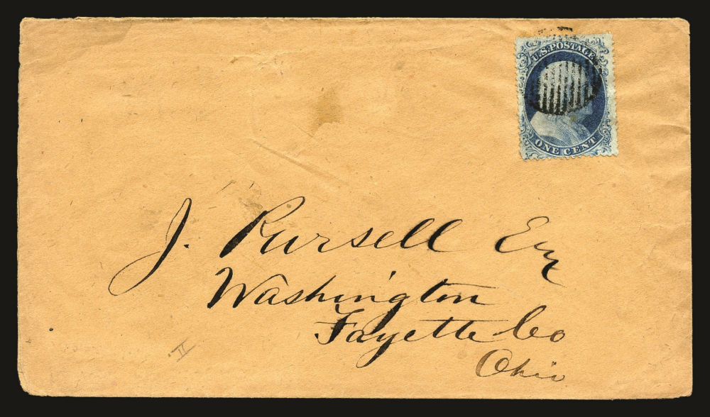 (20) 1857-61 1¢ blue Franklin Type II, position 4R11, T Relief with R2 layout line from the right pane of Plate 11, tied by black grid cancel on cover to Washington, Ohio, small stain at top left of cover, still a fine and scarce example of a Type II from Plate 11 used on cover.