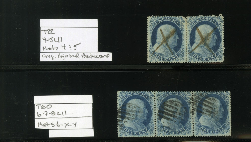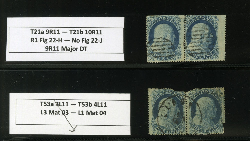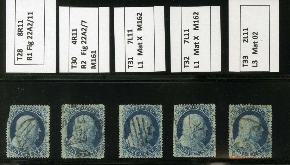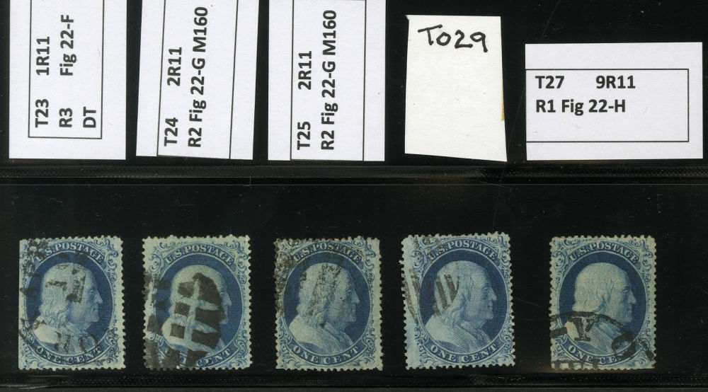 (20) Group of five 1857-61 1¢ blue Franklin Type II, used T Relief singles from Plate 11, including position 1R11 with double transfer used by New York cds (census T23), position 2R11 used by segmented cork cancel, ex. Neinken & Wagshal (census T24), position 2R11 (census T25), position 9R11 used by partial New York cds (census T27) and T Relief used by partial grid cancel (census T29). Range of faults noted but overall a fine and useful group of Plate 11 T Relief stamps.