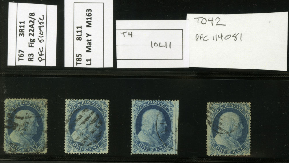 (20) Group of four 1857-61 1¢ blue Franklin Type II, used T Relief singles from Plate 11, including position 3R11 used by partial cds cancel, 2013 PFC noting tiny perforation repairs at left and bottom (census T67), position 8L11 used by grid cancel (census T85), position 10L11 with guideline at right and small part of stamp at right used by partial cds cancel (census T4), and T Relief single used by grid cancel (census T42). A few faults noted but overall a fine and useful group of Plate 11 T Relief stamps.
