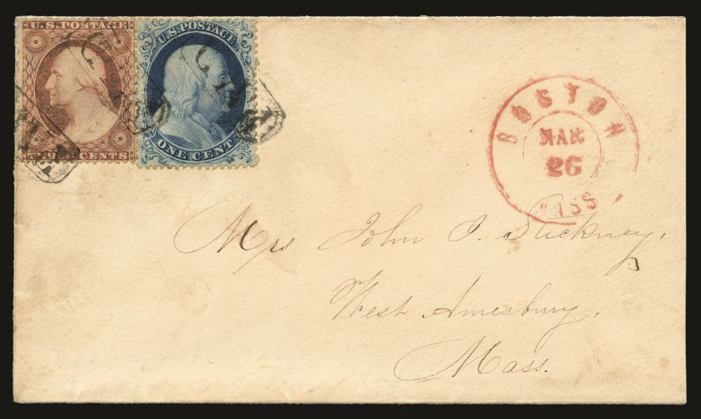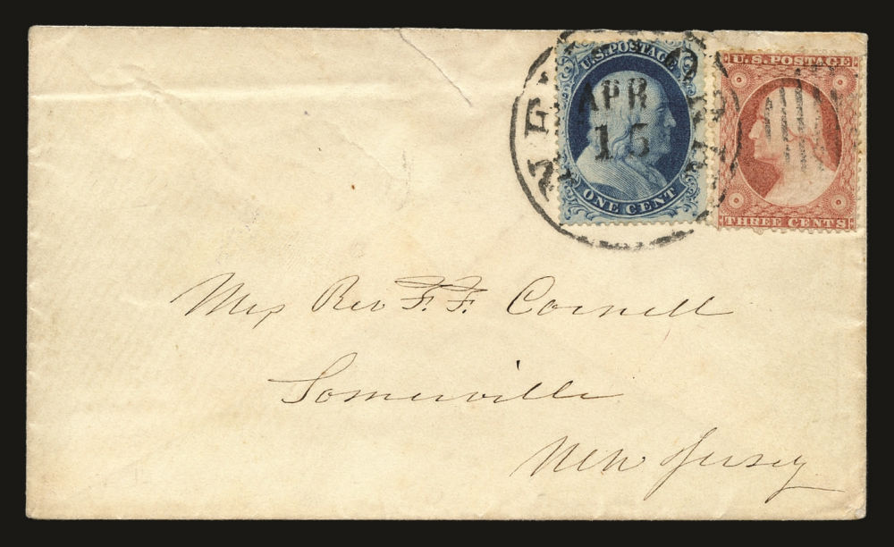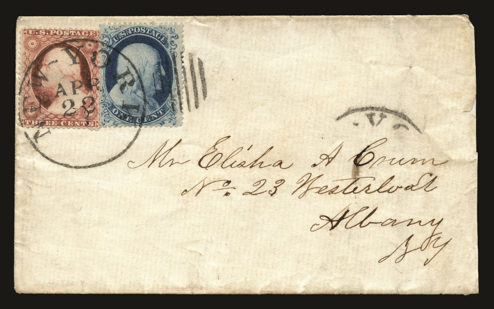 (22) 1857-61 1¢ blue Franklin Type IIIa, B Relief from Plate 11, tied with 1857-61 3c stamp by black "New York Apr 22 (1861)" cds on cover to Albany, NY, slight edgewear at far right from opening. The cover includes the original letter sent between brothers with fascinating content, detailing the one brother's attendance at the Great Meeting at Union Square the day before (April 20) - "I saw Major Anderson and Captain Doubleday but did not hear them speak...I never saw so large a crowd of people...on the Washington statue the Fort Sumpter banner is waving...This morning I went to see the 71st Regiment leave for Washington together with the 12th and 2nd Regiments...There is a $3,000 offered for Jeff Davis and General Beauregard dead or alive..." A nice example of the 1¢ Plate 11 stamp paying the carrier fee for a letter reporting on the important events in the North with the Civil War underway.