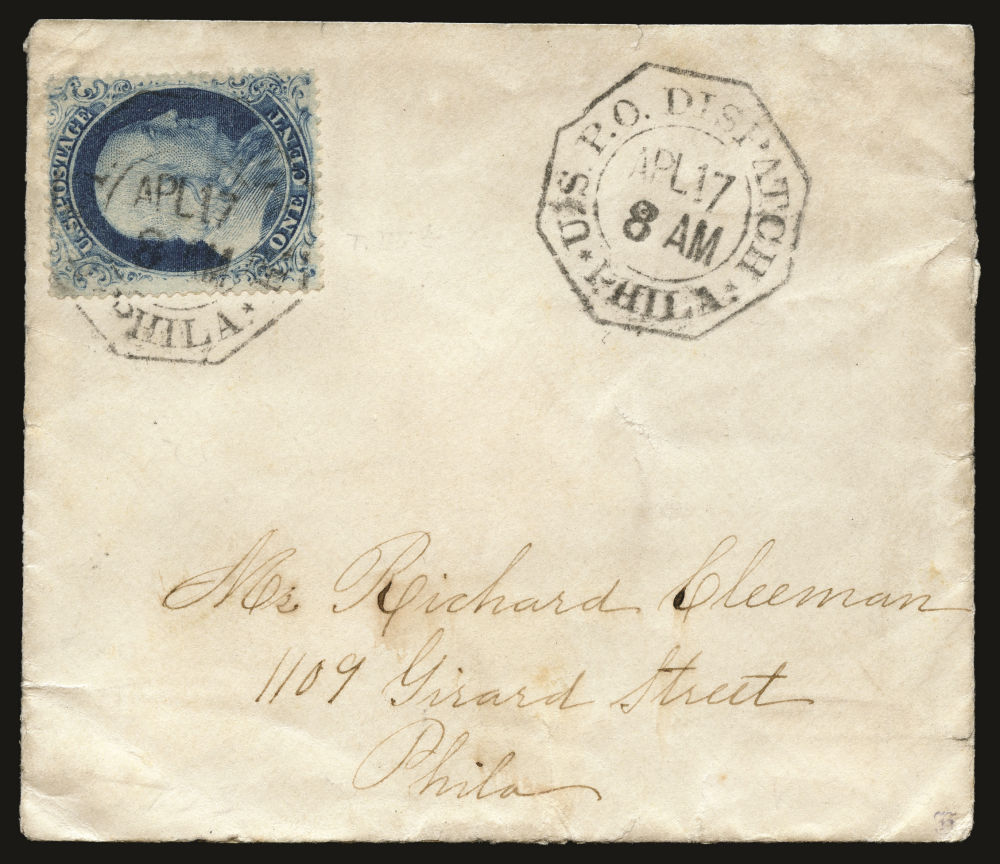 (22) 1857-61 1¢ blue Franklin Type IIIa, B Relief from Plate 11, tied by wonderful "Phila U.S.P.O. Dispatch Apl 17 (1861)" octagonal datestamp and repeated at right on cover to Philadelphia address, 1c slightly affected by top left cover bend but still, fine-v.f.