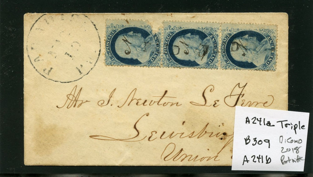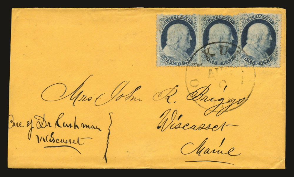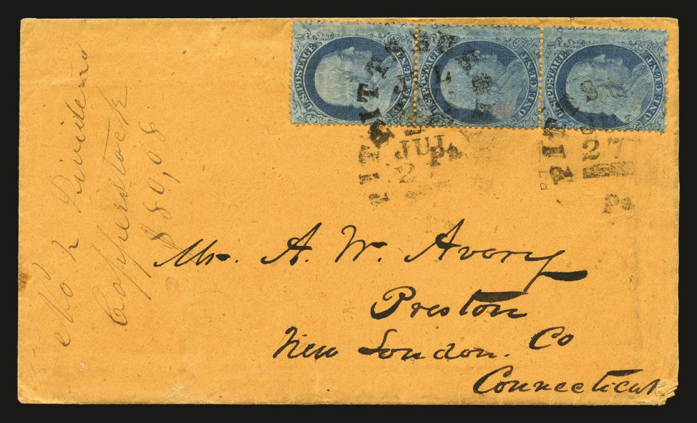 (22) 1857-61 1¢ blue Franklin Type IIIa, A/B/B Reliefs with L3/L2 layout lines from the left pane of Plate 11, vertical strip of three tied by black "Pittsburgh, PA July 27 (1861)" cds cancels on cover to Preston, CT with original letter included, fine-v.f. and scarce example of a Plate 11 multiple used on cover.
