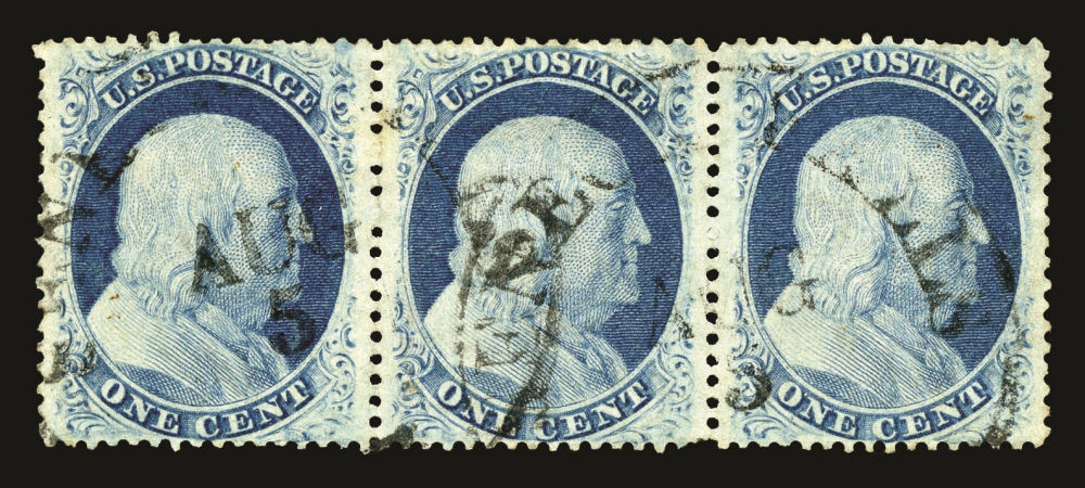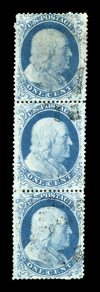 (24) 1857-61 1¢ blue Franklin Type V, positions 75-77R5, used vertical strip of three with curl in hair on position 75R5, right stamp with a tiny thin otherwise a fine-v.f. Plate 5 strip of three.