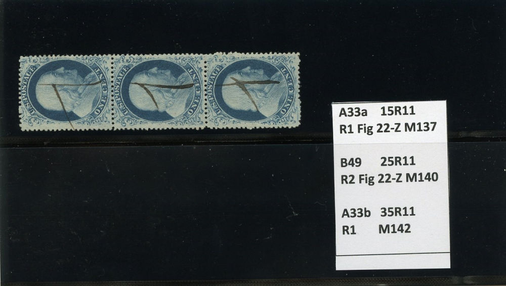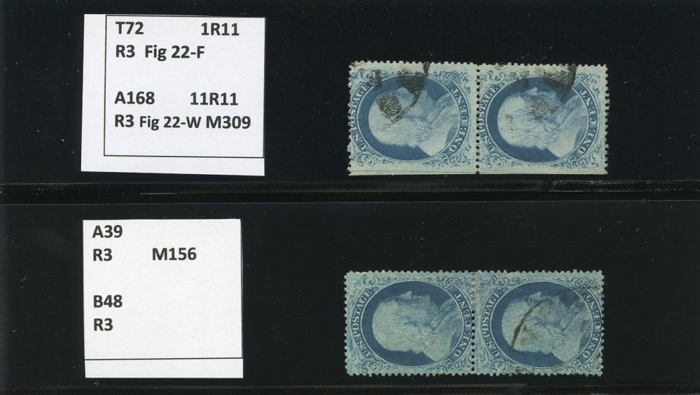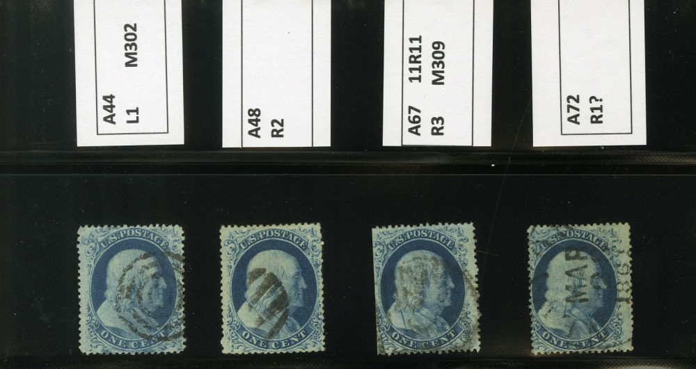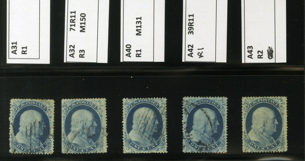 (22) Group of nine 1857-61 1¢ blue Franklin Type IIIa, used A Relief singles from Plate 11, including A Relief used by black grid cancel (census A31), position 71R11 used by partial cds cancel (census A32), A Relief with double transfer used by black grid cancel (census A40), position 39R11 used by parital black cds cancel (census A42), A Relief regummed (census A43), A Relief used by black target cancel (census A44), A Relief used by black grid cancel (census A48), position 11R11 used with black cancel (census A67), and A Relief used by black March 29 1861 dated cds (census A72). A few faults noted but overall a fine-v.f. and useful group of Plate 11 A Relief singles.