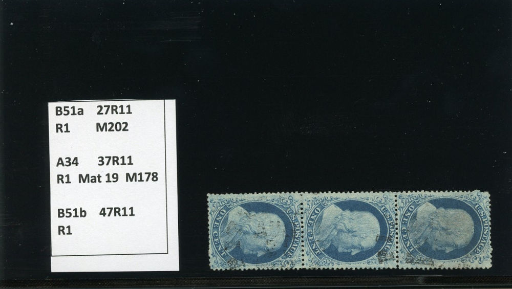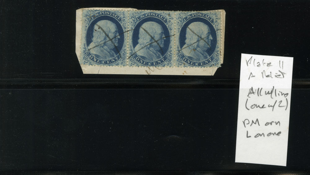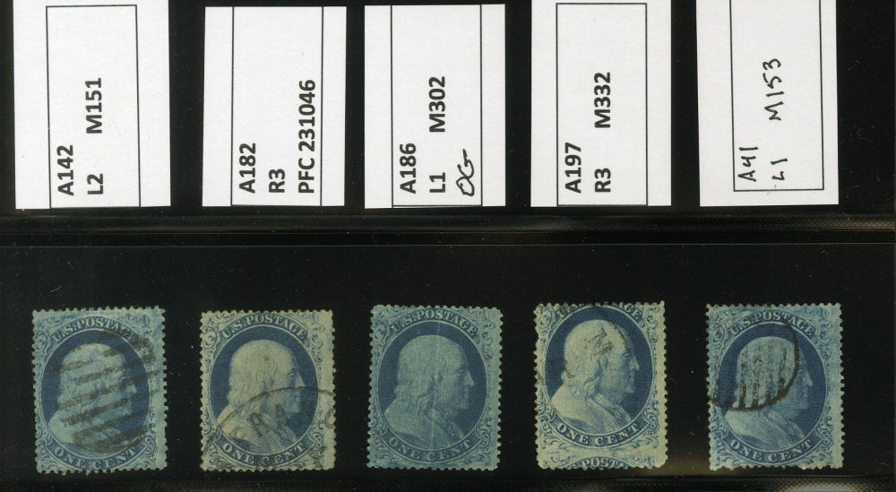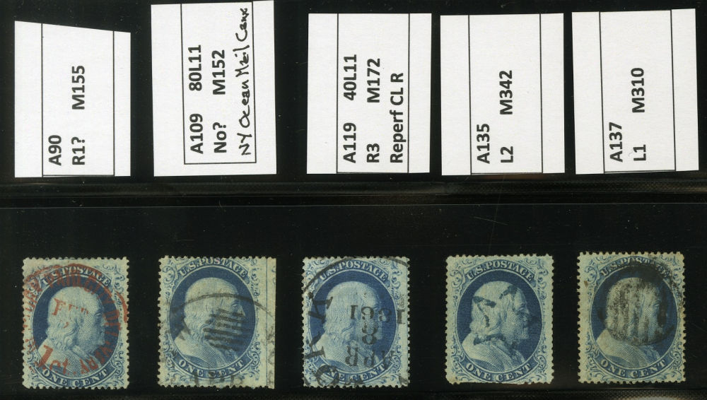 (22) Group of ten 1857-61 1¢ blue Franklin Type IIIa, used A Relief singles from Plate 11, including A Relief with stunning red New York City carrier cancel (census A90), position 80L11 with straddle margin and guideline at right including part of stamp at right used by New York City ocean mail cds (census A109), position 40L11, reperforated at right and used with "New York Apr 8 1861" CDS (census A119), A Relief used by blue star cancel (census A135), A Relief used by black grid cancel (census A137), A Relief used by black grid cancel (census 142), A Relief used by San Francisco cds with 1990 PFC noting small crease and thin at top, repair at bottom (census A182), A Relief mint single with horizontal crease (census A186), A Relief used by partial black cds (census A197), and A Relief used by black grid cancel (census A41). A few faults noted but overall a fine-v.f. and useful group of Plate 11 A Relief singles.