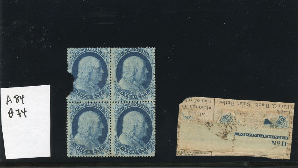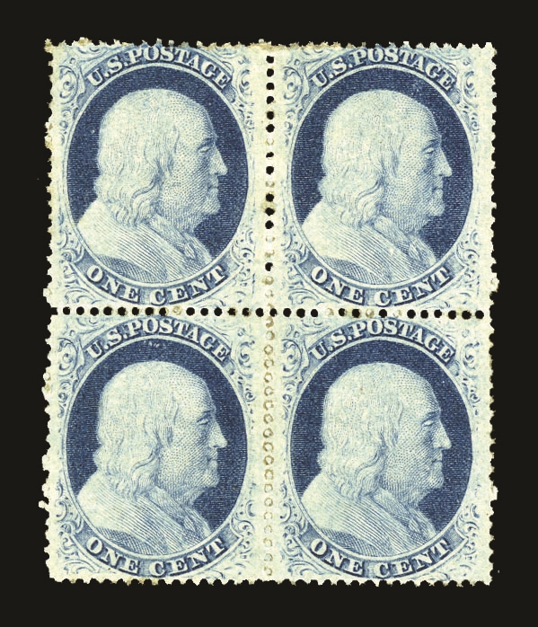 (24) 1857-61 1¢ blue Franklin, positions 38-39/48-49L8, unused with original gum, previously hinged block of four, a few small inclusions visible but overall fine-v.f. Cat value $800.