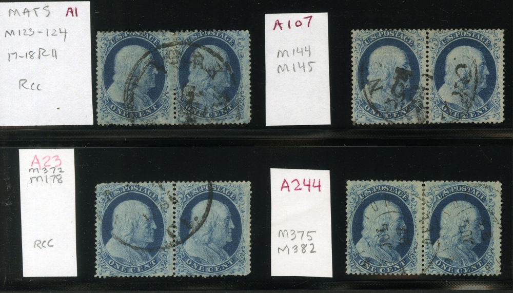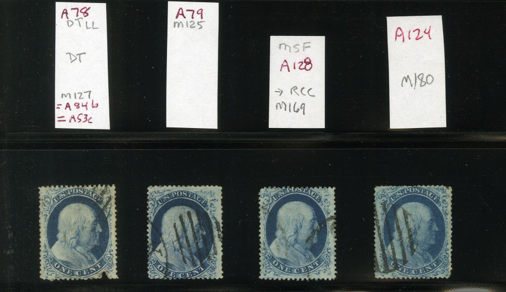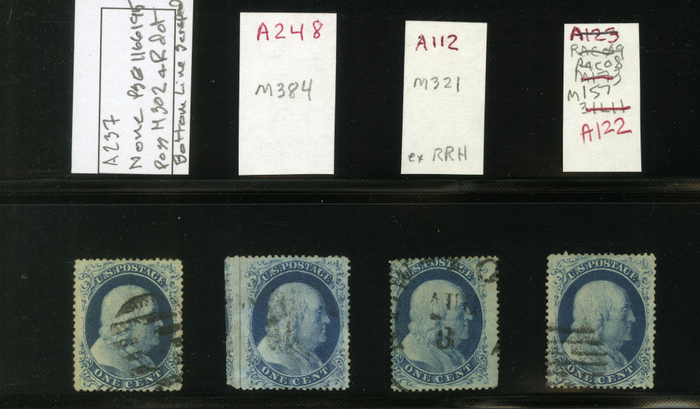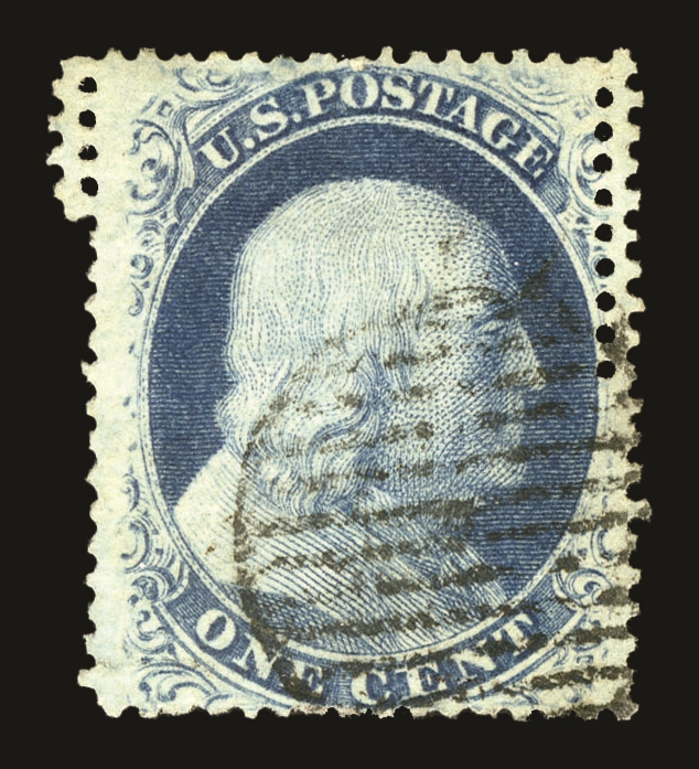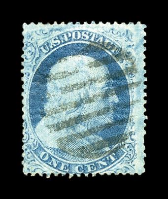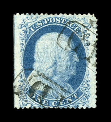 (22) Group of eight 1857-61 1¢ blue Franklin Type IIIa, used A Relief singles from Plate 11, including A Relief with double transfer used by black grid cancel (census A78), A Relief with double transfer used with black grid cancel (census A79), A Relief used by partial black cds cancels (census A128), A Relief used with black grid cancel (census A124), A Relief used with black grid cancel (census A237), A Relief with straddle margin and guideline at left including part of stamp at left used by black cancel (census A248), A Relief used by black cds cancel (census A112), and A Relief used by black grid cancel (census A122) A few faults noted but overall a fine-v.f. and useful group of Plate 11 A Relief singles. All ex. Celler except for census A237, cat. value $4,250.