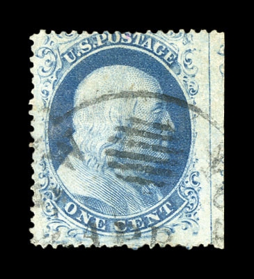 (24) 1857-61 1c blue Franklin Type V with double perforations at right near top, used with black circular grid cancel, fine-v.f.