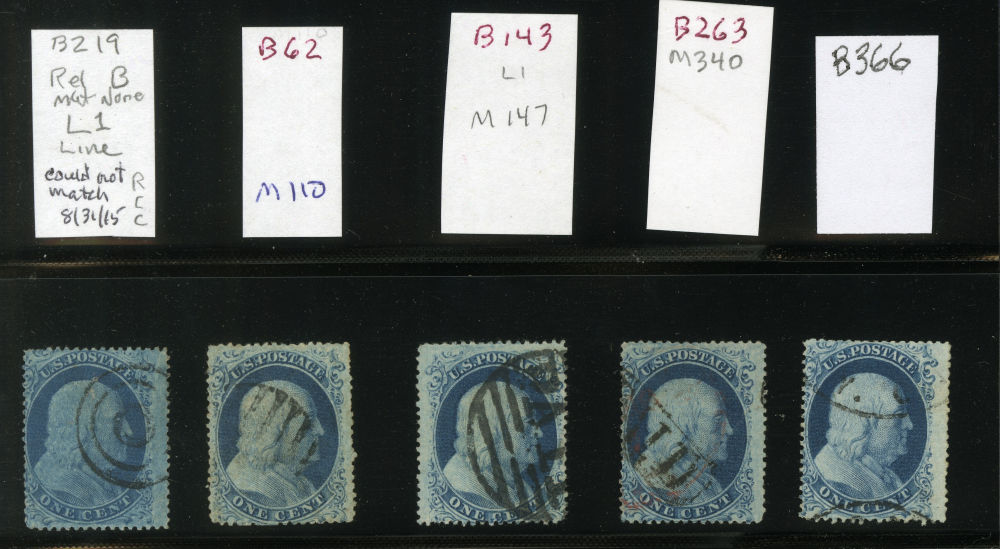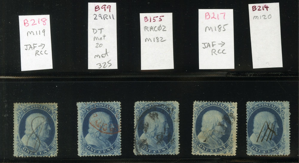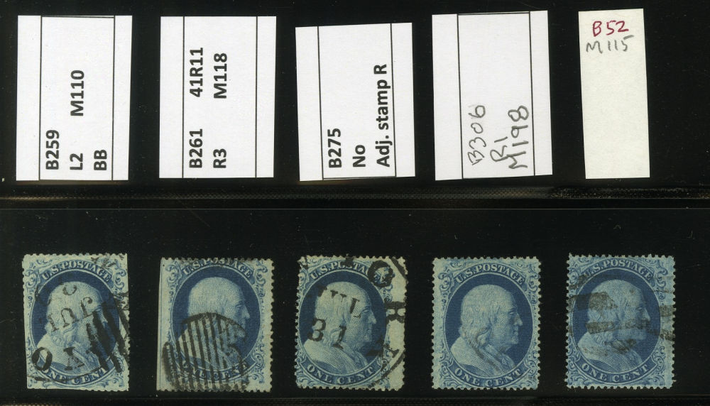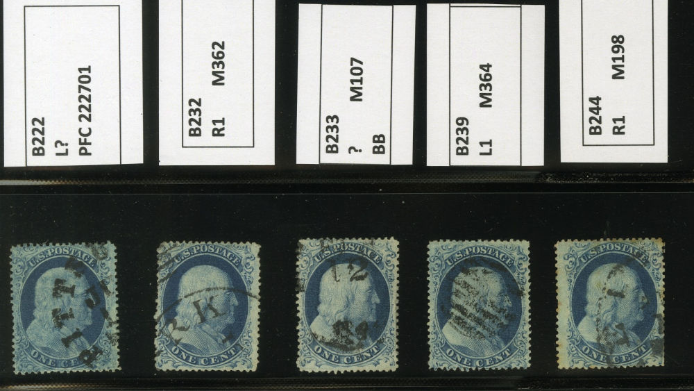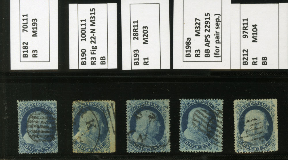 (22) Group of ten 1857-61 1¢ blue Franklin Type IIIa, B Relief singles from Plate 11, including position 70L11 used by black grid cancel (census B182), position 100L11 with guideline at right used by New York cds cancel (census B190), position 28R11 used by partial black cds (census B193), B Relief used by black grid cancels with 1975 APS cert for pair (census B198a), position 97R11 used by black grid cancel (census B212), B Relief used by partial black Pittsburgh cds (census B222), B Relief used by partial dsc (census B232), B Relief used by partial black cds (census B233), B Relief used by black grid cancel (census B239), and B Relief used by partial black cds (census B244). A few faults noted but overall a fine-v.f. and useful group of Plate 11 B Relief singles.