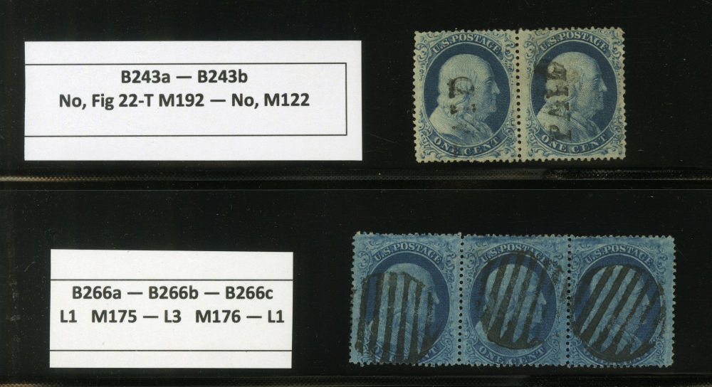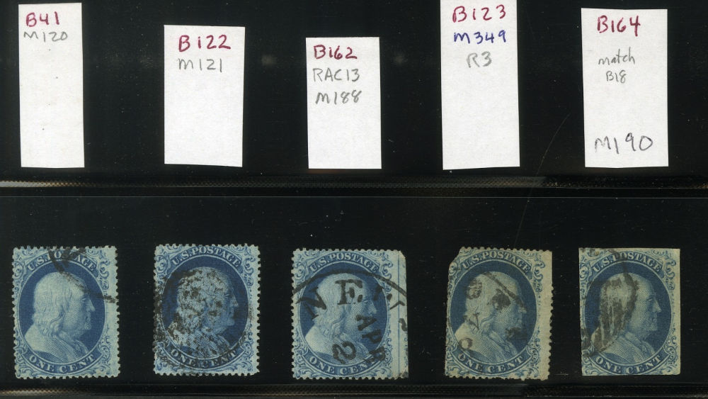 (22) Group of ten 1857-61 1¢ blue Franklin Type IIIa, used B Relief singles from Plate 11, including B Relief used by partial black CDS (census B41), B Relief with double transfer used by black cancel (census B122), B Relief with straddle margin and guideline at right used by “New York Apr 2” cds (census B162), B Relief used by partial black cds (census B123), B Relief used by partial “PAID” in grid cancel (census B164), B Relief with double transfer with partial “New York Jul 20” cds (census B259), position 41R11 with guideline at left used by black grid cancel (census B261), position 81L11 used by partial “New York Jul 31” cds (census B275), B Relief used by light black cancel (census B306), and B Relief used by black cancel (census B52). A few faults noted but overall a fine-v.f. and useful group of Plate 11 B Relief singles. The following are ex. Celler: B41, B52, B122, B123, B162 & B164. Cat. value $5,300+