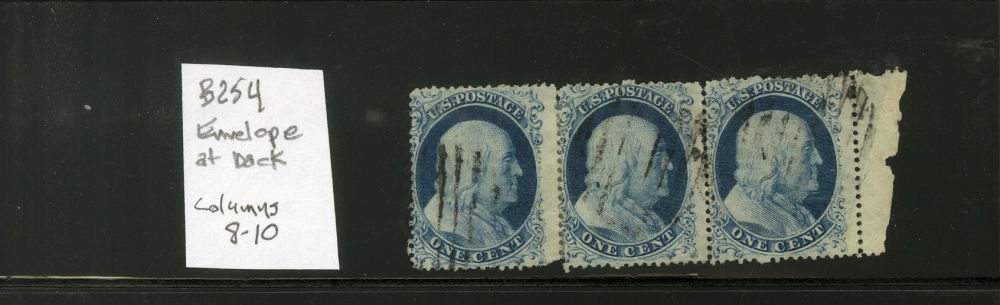 (22) Group of eight 1857-61 1¢ blue Franklin Type IIIa, B Relief stamps from Plate 11, comprising one pair and two strips of three including B Relief strip of three from column 8-10 on right pane with sheet margin at right used by grid cancels with original cover it was sent on included (census B245), B Relief strip of three with mottled impression used by three black grid cancels (census B266a-b-c), and B Relief horizontal pair with straightline "PAID" cancel (census B243a-b). A few faults noted but overall a fine-v.f. and useful group of Plate 11 B Relief multiples.