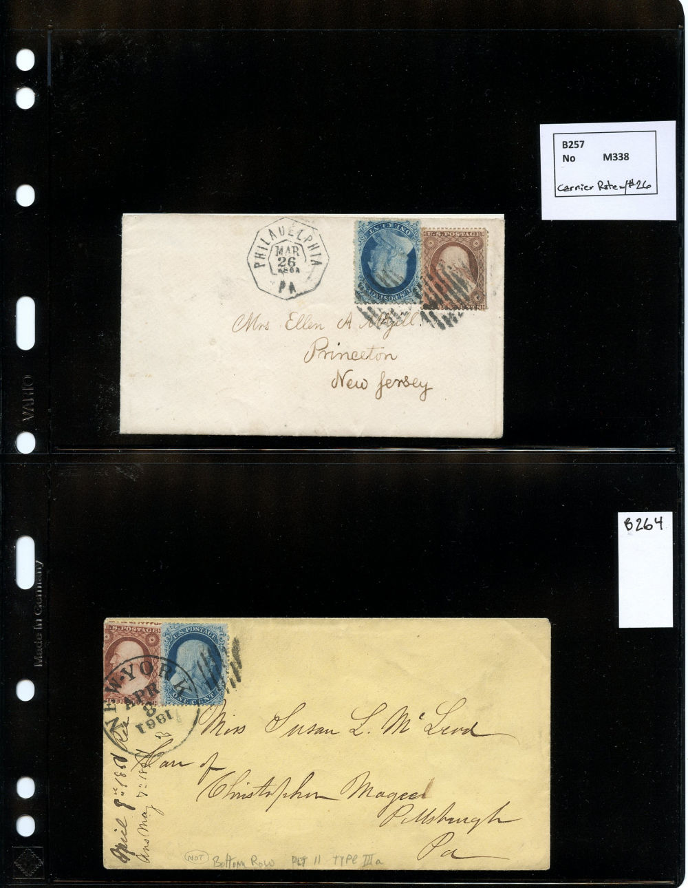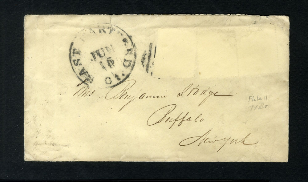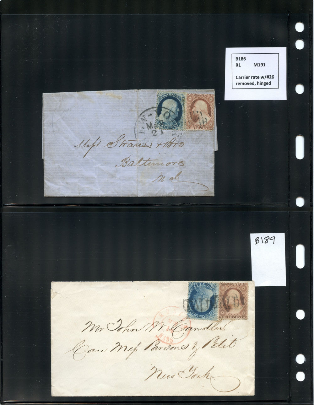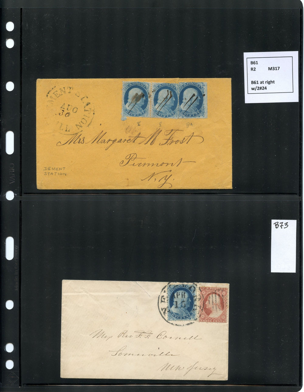 (22) 1857-61 1¢ blue Franklin Type IIIa, group of eight items including six covers, one folded letter and one printed circular, all franked with a B Relief from Plate 11, some as solo frankings and some with other 1857-61 1¢ or 3¢ stamps. Wide variety of cds cancels including Boston, New York, Philadelphia and Dement Station, IL, faults noted including damage to backflaps, cover edgewear but overall the 1c Plate 11 stamps are in fine-v.f. condition, a wonderful group ready for further study.