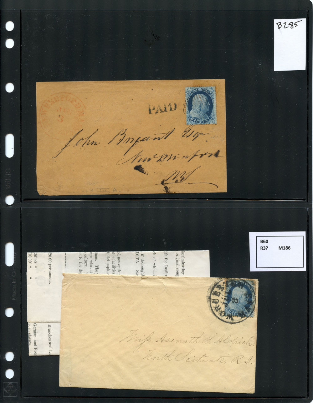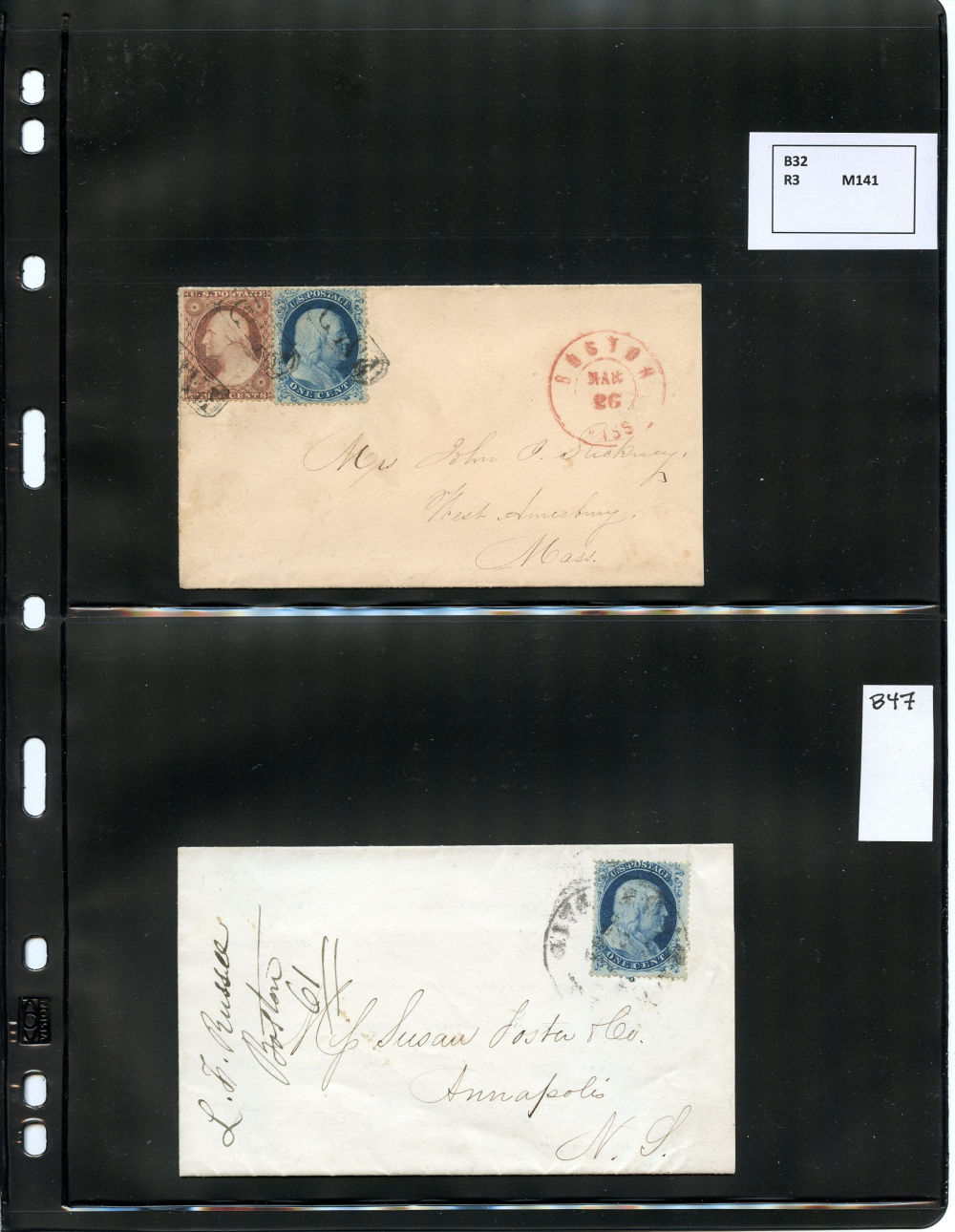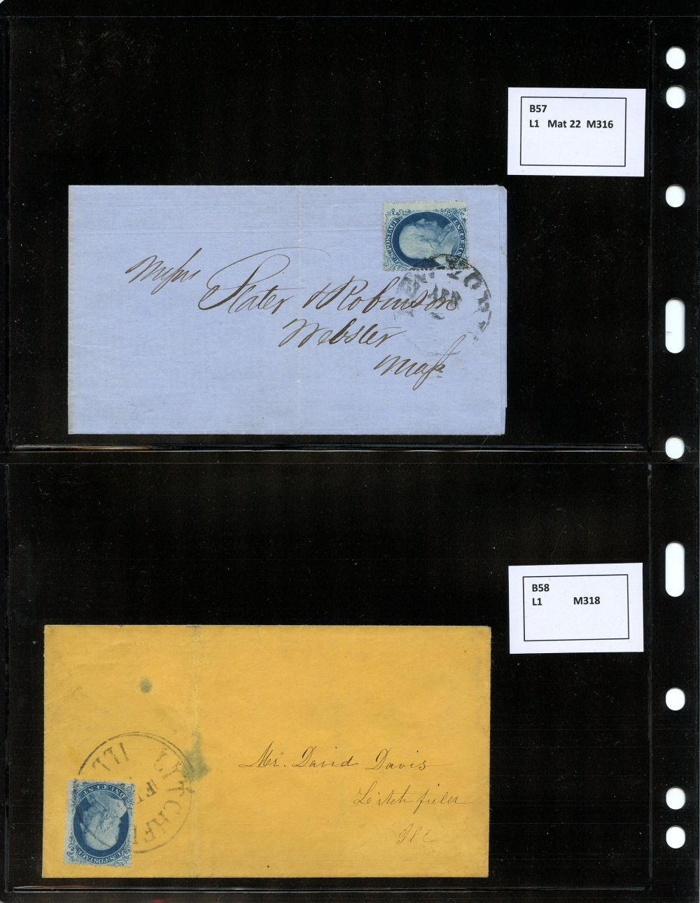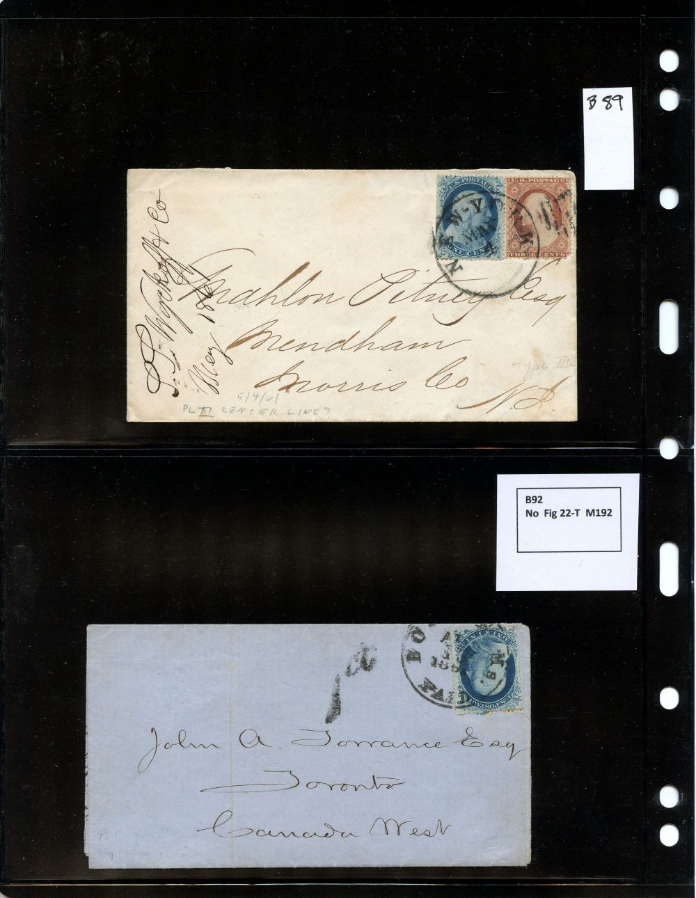 (22) 1857-61 1¢ blue Franklin Type IIIa, group of eight items including six covers, one folded letter and one printed circular, all franked with a B Relief from Plate 11, some as solo frankings and some with other 1857-61 1¢ or 3¢ stamps. Wide variety of cds cancels including Boston, New York, Philadelphia and Dement Station, IL, faults noted including damage to backflaps, cover edgewear but overall the 1c Plate 11 stamps are in fine-v.f. condition, a wonderful group ready for further study.