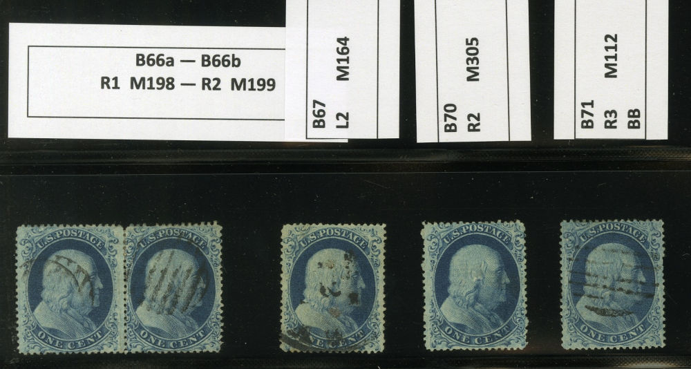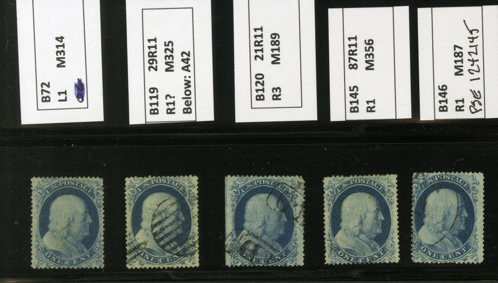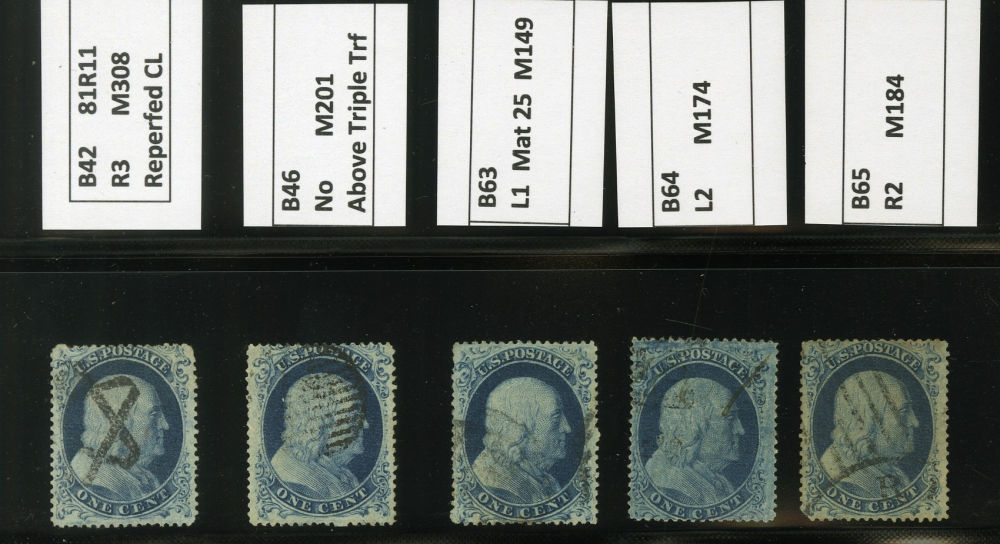 (22) Group of fifteen 1857-61 1¢ blue Franklin Type IIIa, B Relief singles including one pair from Plate 11, starting with position 81L11 reperforated at left used by black cancel (census B42), B Relief used with black grid cancel (census B46), B Relief with double transfer used by black cancel (census B63), B Relief used by light black cancel (census B64), B Relief used by partial black grid and cds cancels (census B65), B Relief horizontal pair used by grid cancels (census B66a-b), B Relief used by partial black cds cancel (census B67), B Relief used (census B70), B Relief used by black grid cancel, ex. Wagshal (census B71), B Relief mint (census B72), position 29R11 with double transfer used by black grid cancels (census B119), position 21R11 with guideline at left used by "PAID" cancels (census B120), position 87R11 used (census B145), and B Relief used by partial black cds (census 146). A few faults noted but overall a fine-v.f. and useful group of Plate 11 B Relief singles.