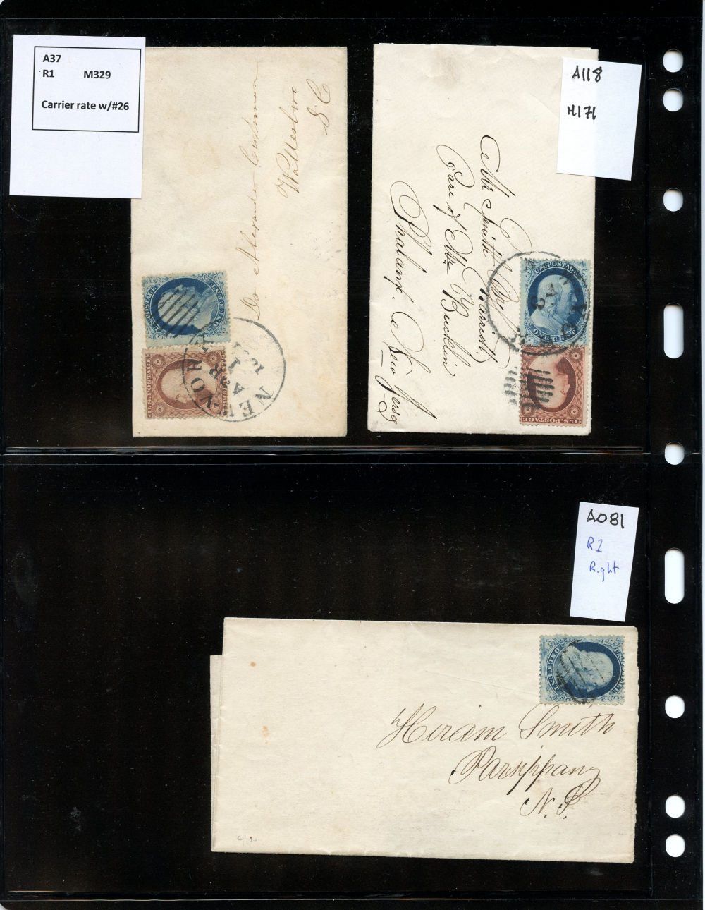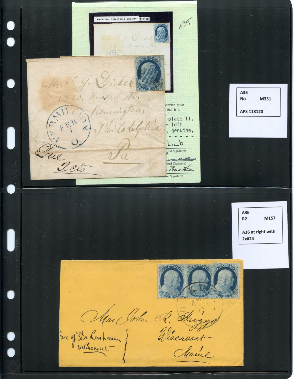 (22) 1857-61 1¢ blue Franklin Type IIIa, group of five covers (one with original contents), all franked with an A Relief from Plate 11, two solo frankings and three with other 1857-61 1¢ or 3¢ stamps. One cover from Vermilion, Ohio to Philadelphia with 1999 APS cert. Faults noted including damage to backflaps, cover edgewear or a few stamps affected from placement at edge but overall the 1¢ Plate 11 stamps are in fine-v.f. condition, a wonderful group ready for further study.