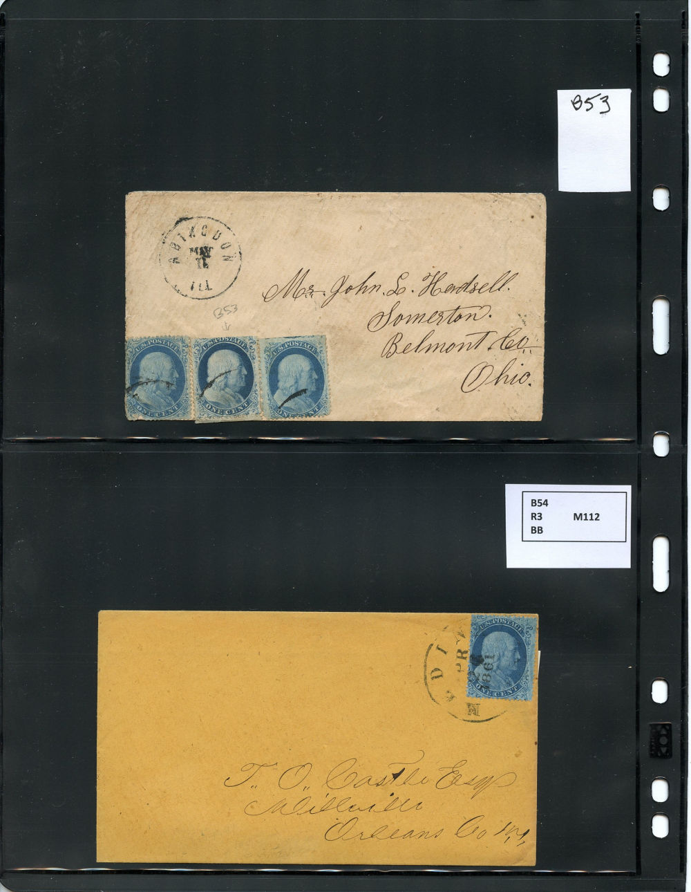 (22) 1857-61 1¢ blue Franklin Type IIIa, group of eight items including six covers (one with original content) and two printed circulars, all franked with a B Relief from Plate 11, some as solo frankings and some with other 1857-61 1¢ or 3¢ stamps. One cover from IL to Somerston, OH is franked with a 1¢ Type V and a Type II from Plate 12. Faults noted including damage to backflaps, cover edgewear or a few stamps affected from placement at edge but overall the 1¢ Plate 11 stamps are in fine-v.f. condition, a wonderful group ready for further study.