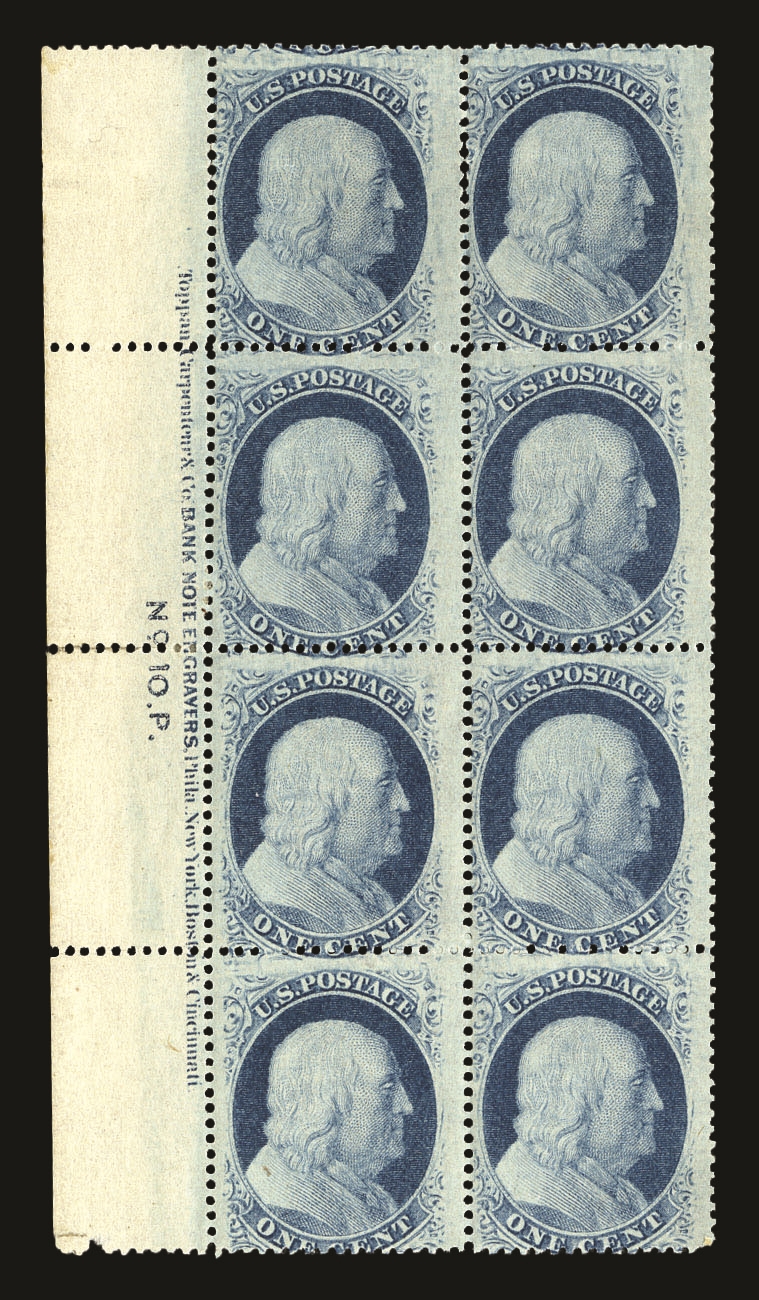 (24) 1857-61 1¢ blue Franklin Type V, positions 31-32/41-42/51-52/61-62L10, unused with original gum, previously hinged in selvage only, plate block of eight showing full left sheet selvage with prominent “Toppan, Carpenter & Co. BANK NOTE ENGRAVERS. Phila. New York, Boston & Cincinnati” imprint and bold “No. 10.P.” plate number. A small skillful repair to the bottom left corner of the selvage is noted. Overall fine centering across this desirable imprint and plate number multiple from Plate 10. With 2025 Philatelic Foundation certificate, cat. value $4,500.